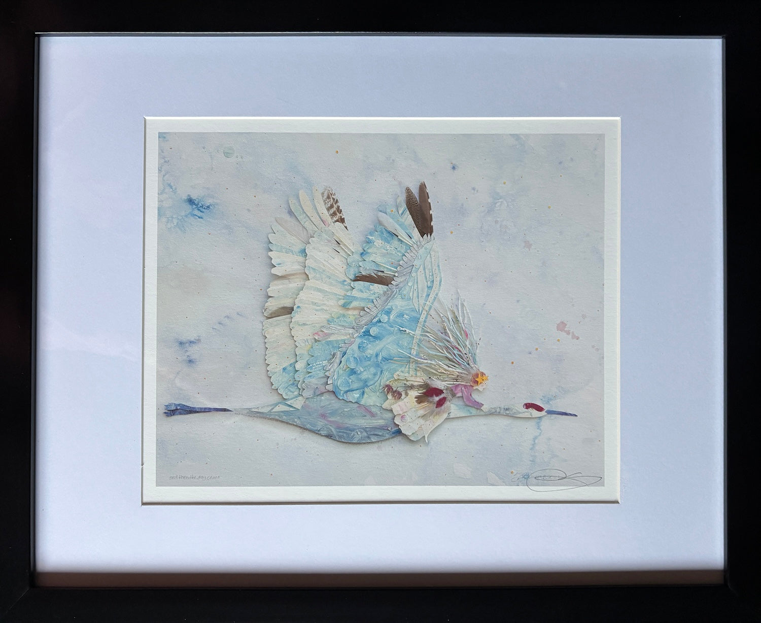 I created the original mixed media collage of this print using cattlemarkers, watercolors, salt, acrylic, porcupine quills, wasp paper, grasses & wildflowers, seeds & leaves, horse hair, legally harvested feathers in Montana and Queen of Hearts vintage sheet music (1893). Hidden in this piece are the constellation Orion, the star Sirius, the planet Jupiter and Jupiter’s four moons, and the full title of the piece, “And then the Day Came When We Left it all Behind and Soared High into the Heavens in Search of Someone greater than us.”