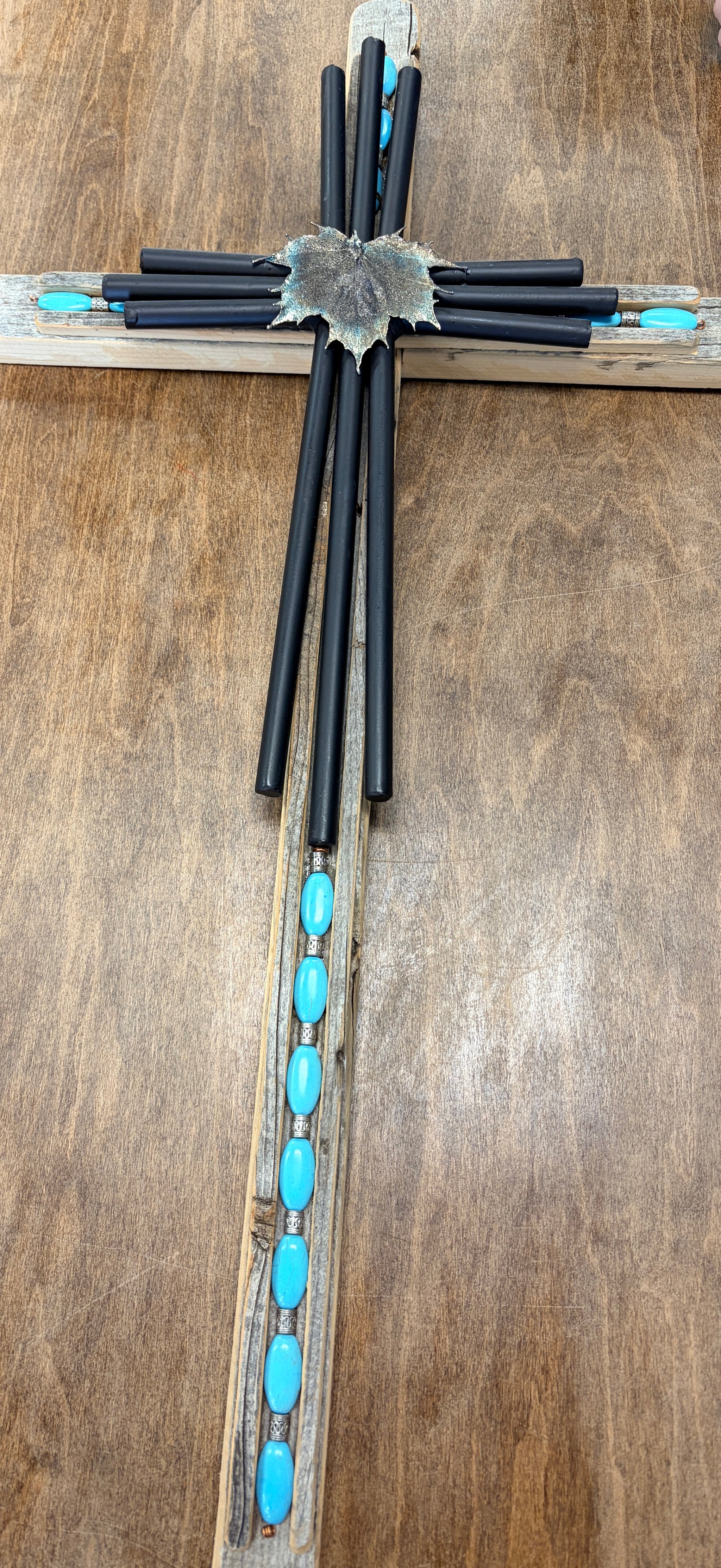Fashioned from recycled old barnwood from an 1869 northern Colorado homestead, this 36-inch-tall cross is beautifully designed with inlaid turquoise beads, metal pipes, and a metal leaf with a metallic patina touched with turquoise edges.