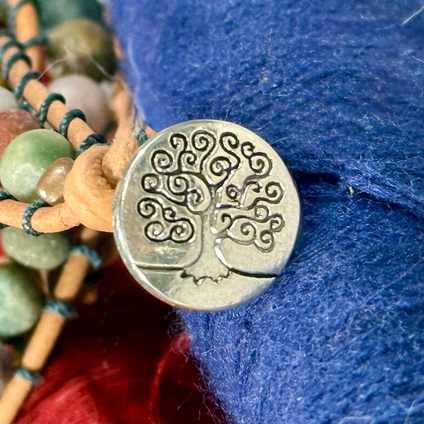 Handmade beaded leather and gemstone double-wrap bracelet Stone: matte multicolor jasper Brown leather Size: 14 inches by Julianne Alley at Blue Moose Art Gallery