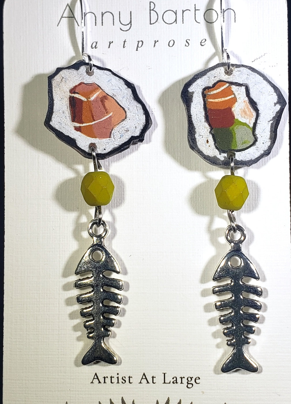 Shrink art sushi w/silver fishes and wasabi colored beads by Ann Barton at Blue Moose Art Gallery