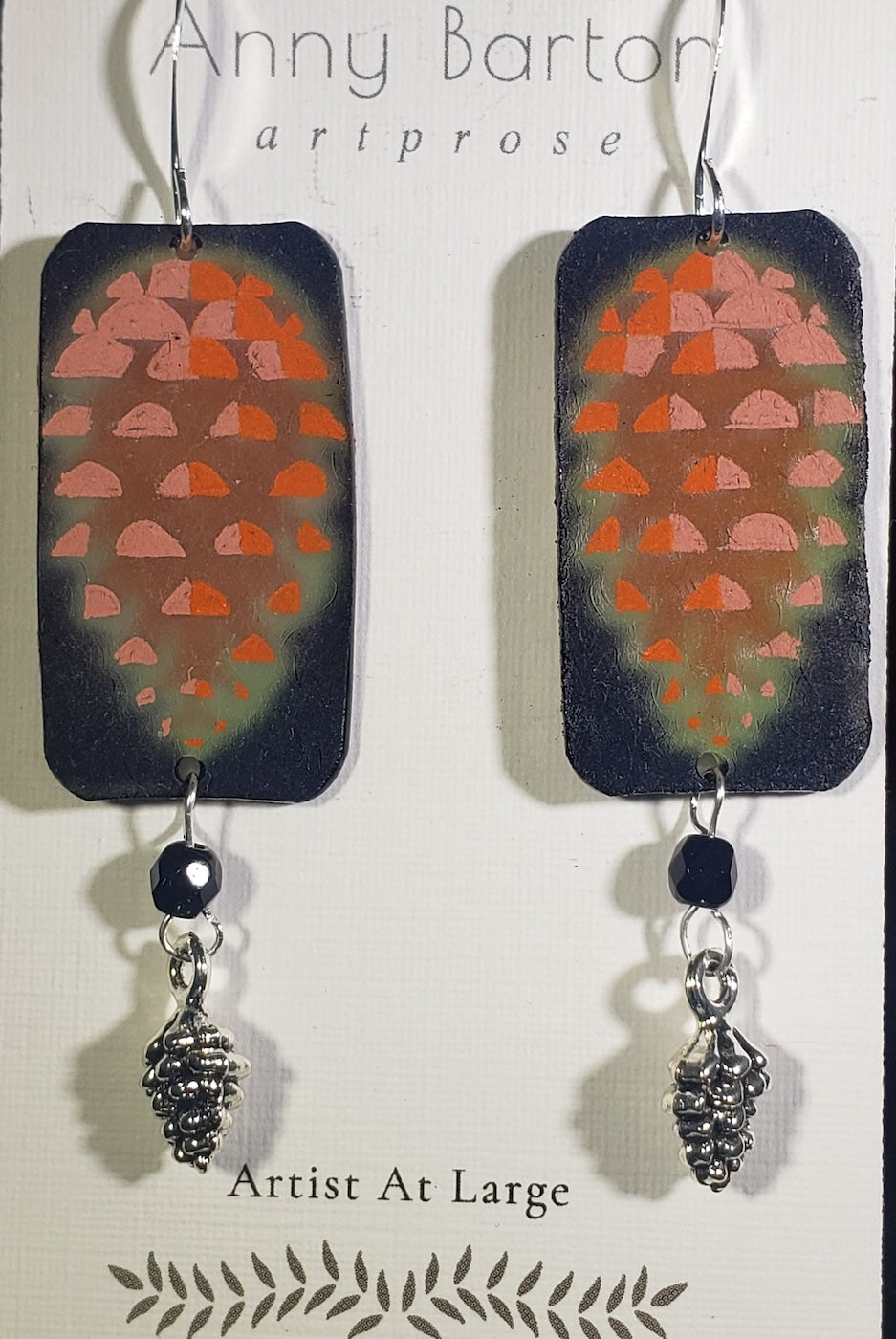 Glowing abstract pinecones on black background w/jet glass beads and silver pinecone charms by Ann Barton at Blue Moose Art Gallery