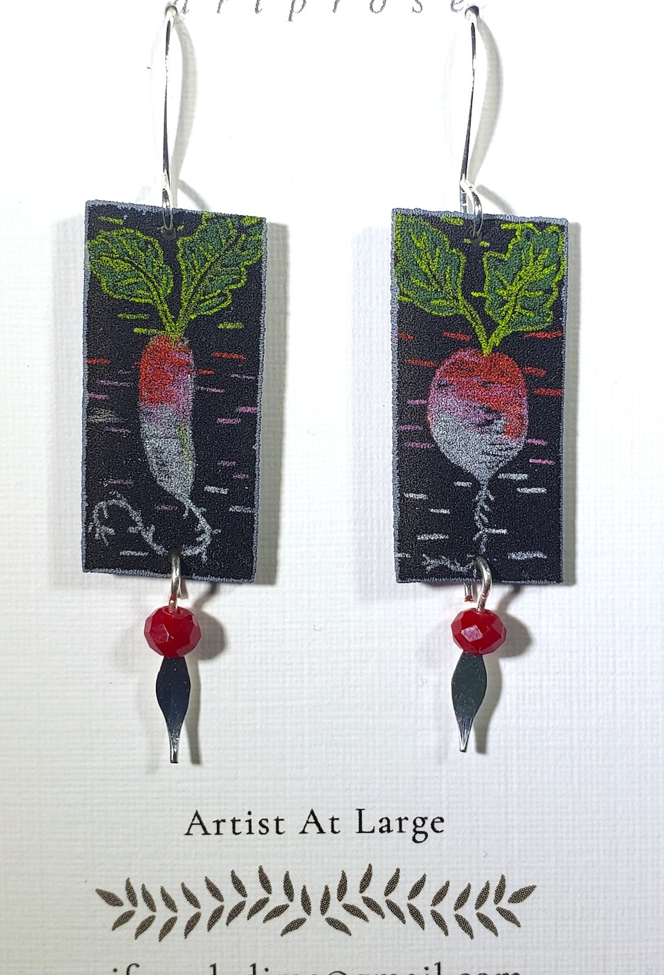 French breakfast and Cherry Belle radishes on black chalkboard background by Ann Barton at Blue Moose Art Gallery