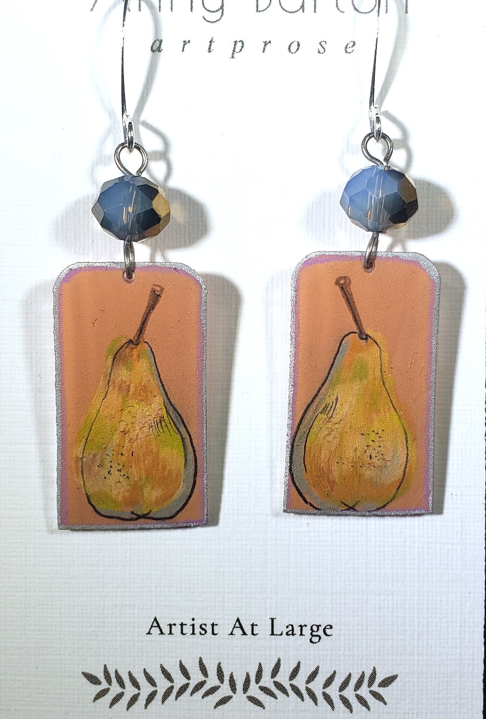 2 pear drawings in pastel colors with a blue and copper glass bead by Ann Barton at Blue Moose Art Gallery