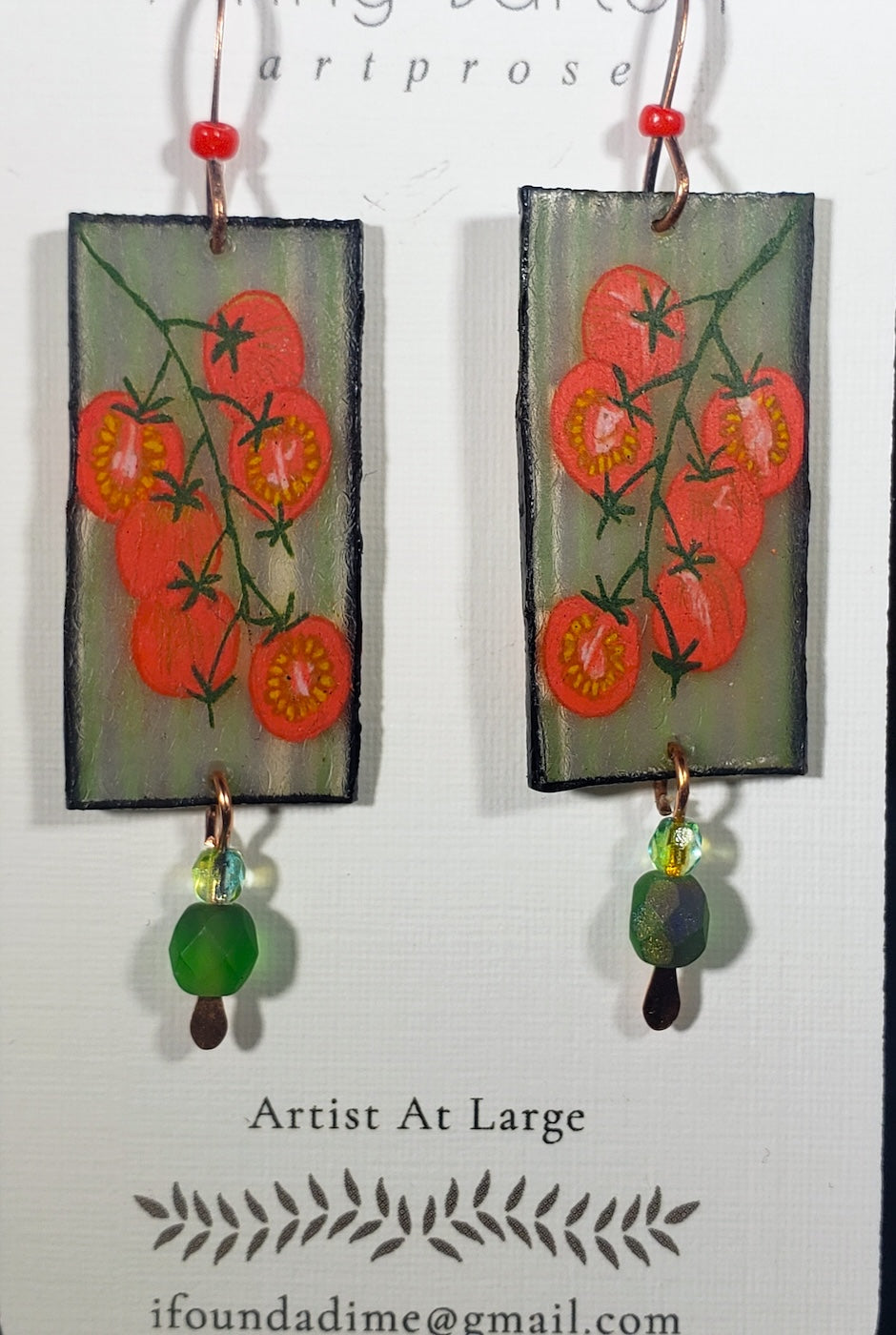Cherry tomato drawing on a grey and green striped background with green glass beads by Ann Barton at Blue Moose Art Gallery