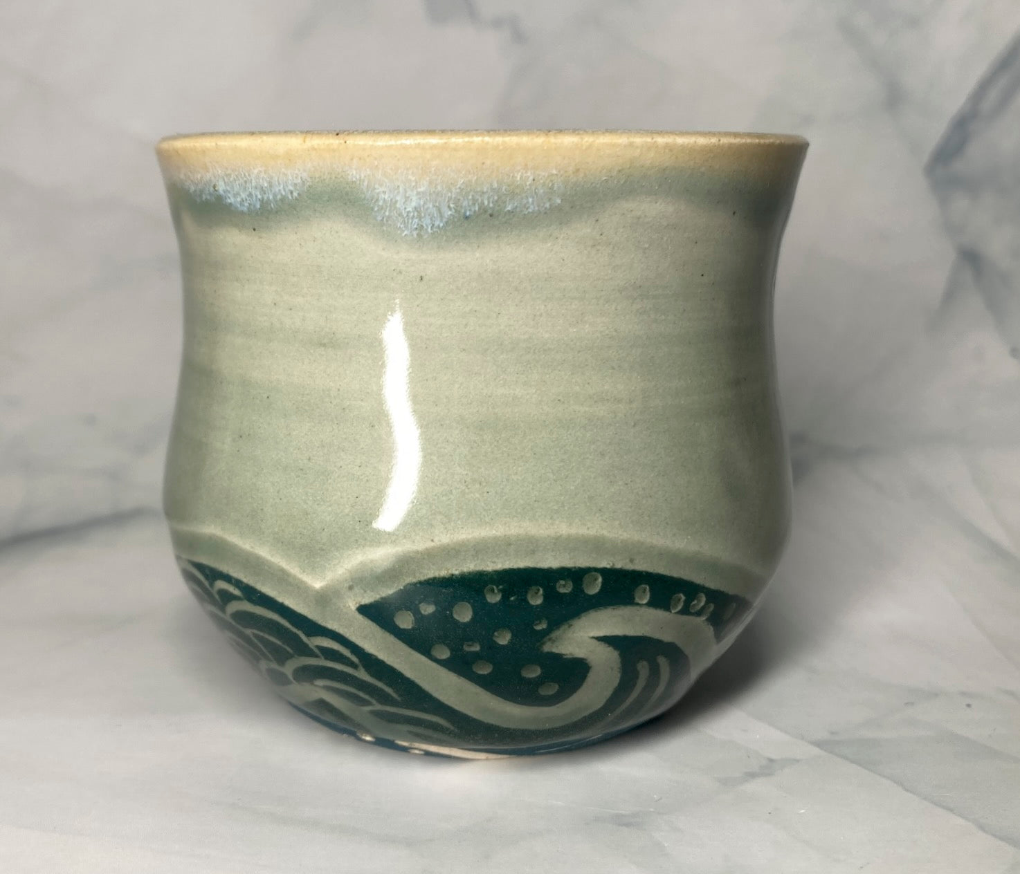 This handmade ceramic cup was thrown on a potters' wheel. This piece is part of my "Streams" series: inspired by rolling mountain waterways. I decorate my work using a process called sgrafitto. I paint colored stains onto the wet clay, and then carve the designs through the color into the clay. After the piece is fired a first time, I add glaze (the glassy top coat), and fire once more. This piece is food safe, microwave safe, and dishwasher safe. It can hold approximately 4 to 6 oz.