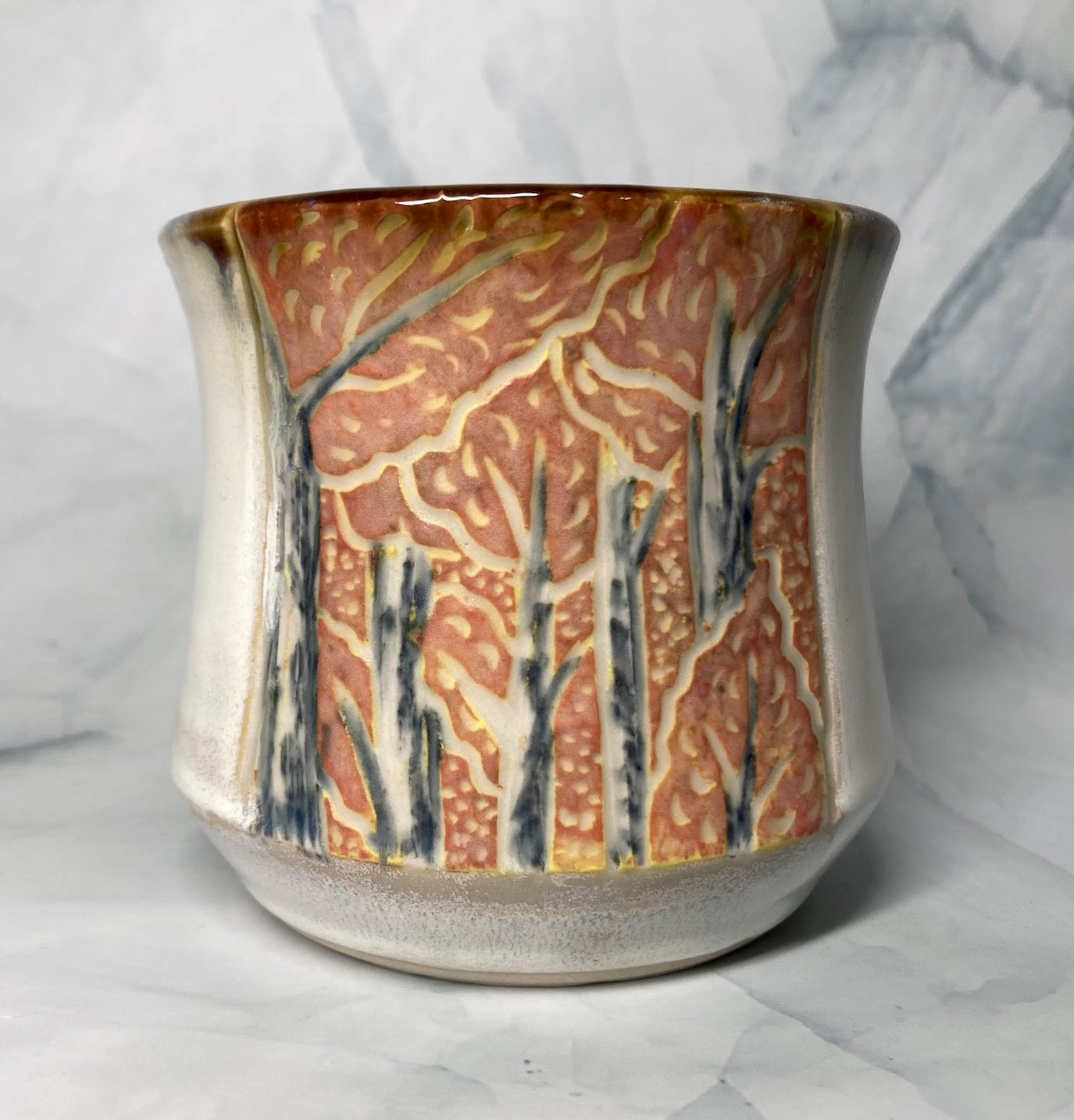 This handmade ceramic mug was thrown on a potters' wheel. This piece is part of my "Meadows" series: inspired by colorful flowers and trees that cover the landscape. I decorate my work using a process called sgrafitto. I paint colored stains onto the wet clay, and then carve the designs through the color into the clay. After the piece is fired a first time, I add glaze (the glassy top coat), and fire once more. This piece is food safe, microwave safe, and dishwasher safe. It can hold approximately 12 to 14 oz.