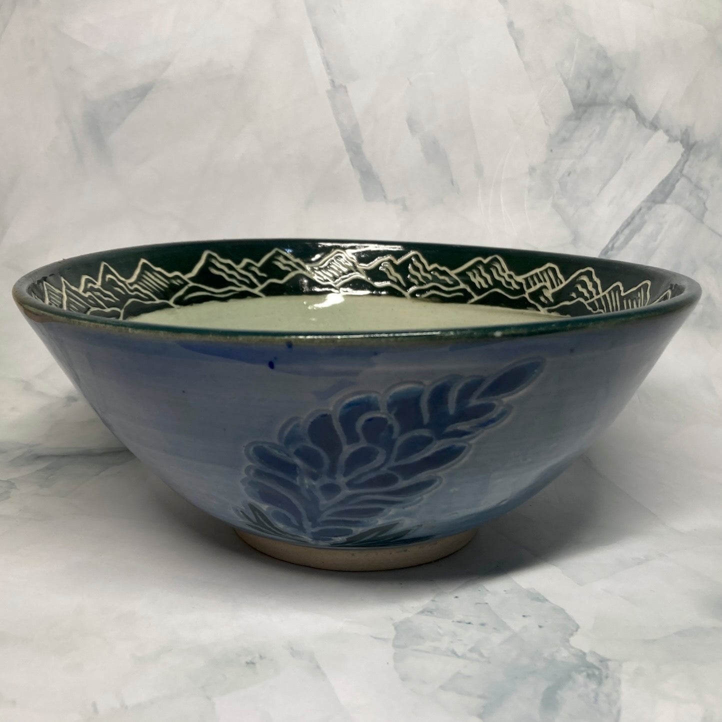 This handmade ceramic bowl was thrown on a potters' wheel. This piece is part of my "Mountains" series: inspired by the breath-taking vistas in the Rockies. I decorate my work using a process called sgrafitto. I paint colored stains onto the wet clay, and then carve the designs through the color into the clay. After the piece is fired a first time, I add glaze (the glassy top coat), and fire once more. This piece is food safe, microwave safe, and dishwasher safe.