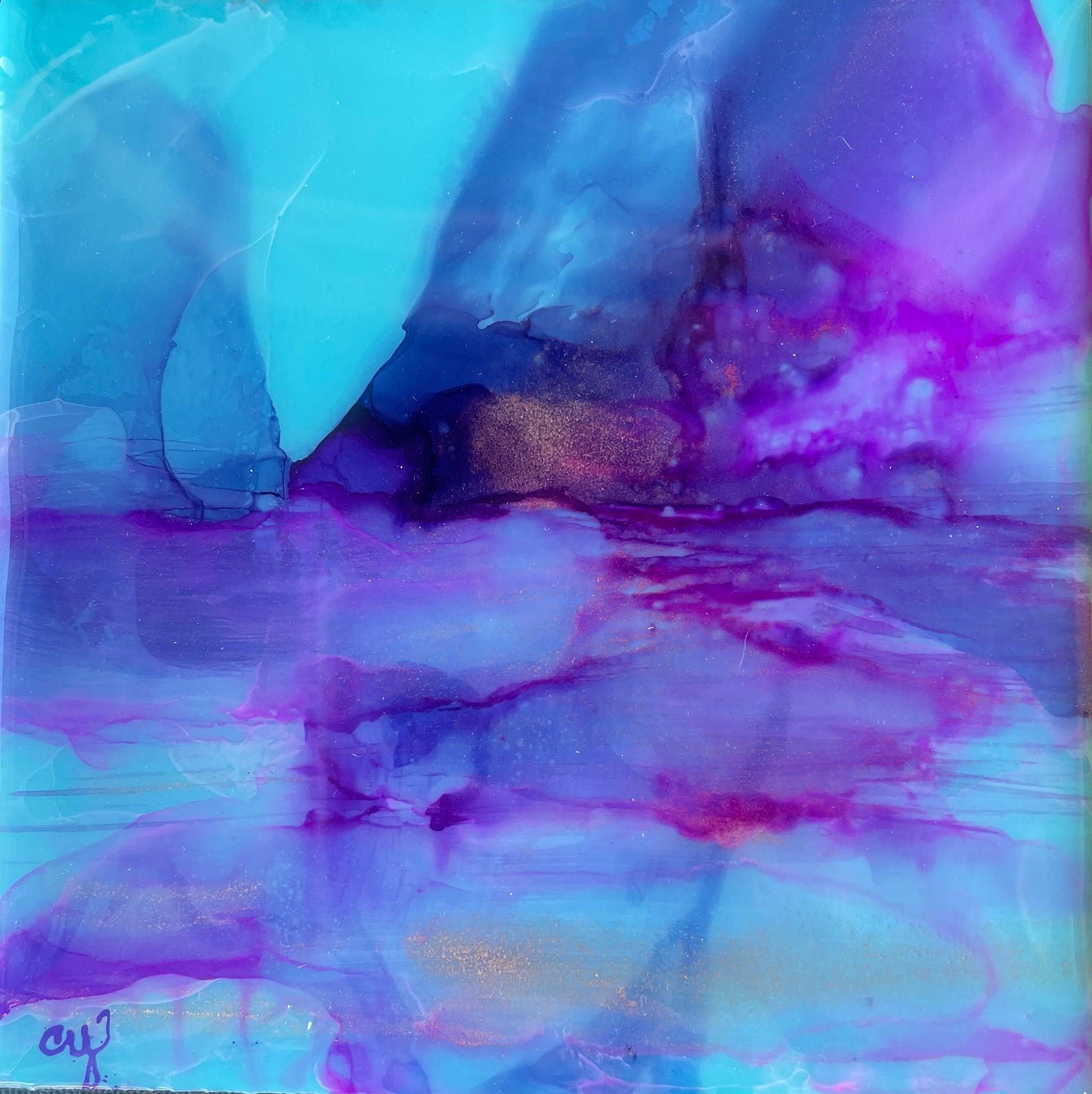 5-inch square cradle board. Through the fog of night appearing images of calm sea and cliffs. Composed of UV protected artist resin, resin pastes, and alcohol inks. Sides painted in pale gold. by Cheryl Yanko at Blue Moose Art Gallery