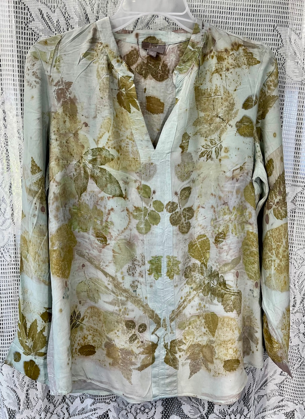 Eco dyed and printed up cycled silk blouse. CARE: Hand wash warm water with ph neutral detergent. Line dry or place in dryer on delicates. Iron on silk setting. by Paula Morris at Blue Moose Art Gallery