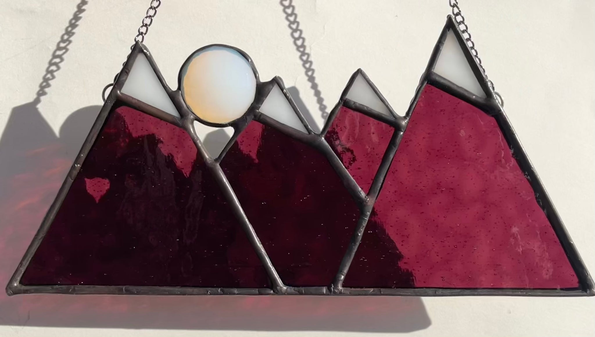 This luminous maroon mountain range is made from a maroon colored glass and is topped with white snowy mountain peaks. The moon rising above these mountains is a faceted opal white glass gem.