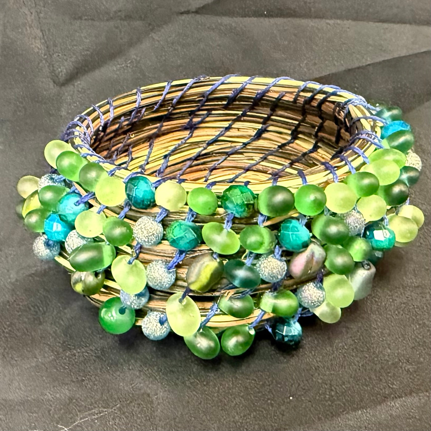 5 inches round by 3 inches tall. Blue Tree charm for center and accented with green glass beads by Lisa Winta at Blue Moose Art Gallery