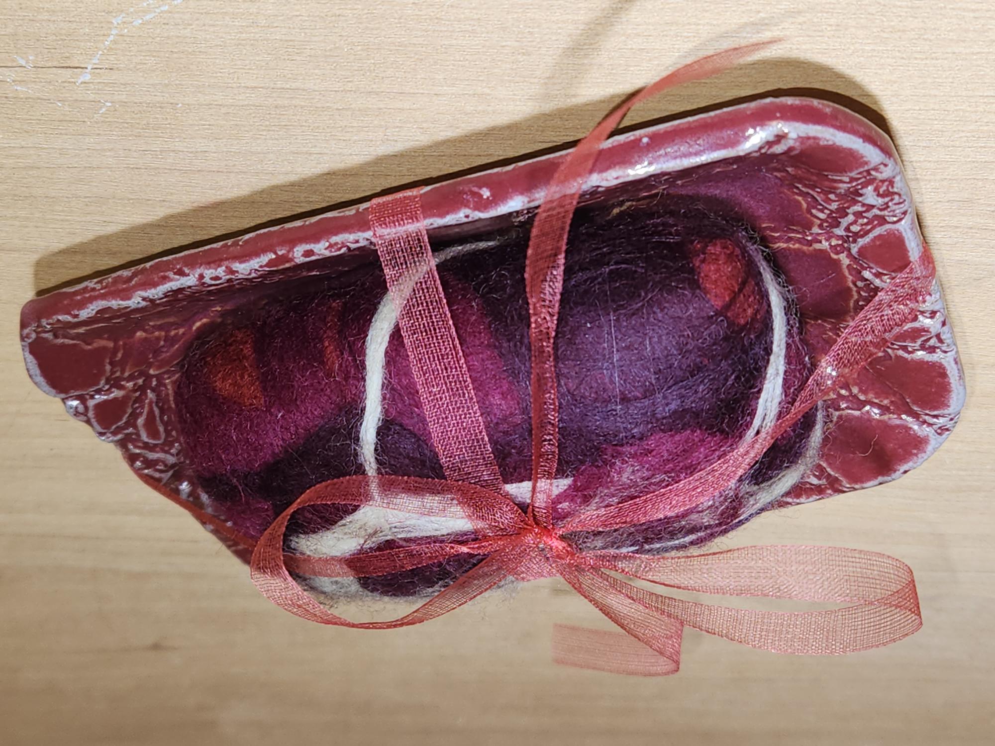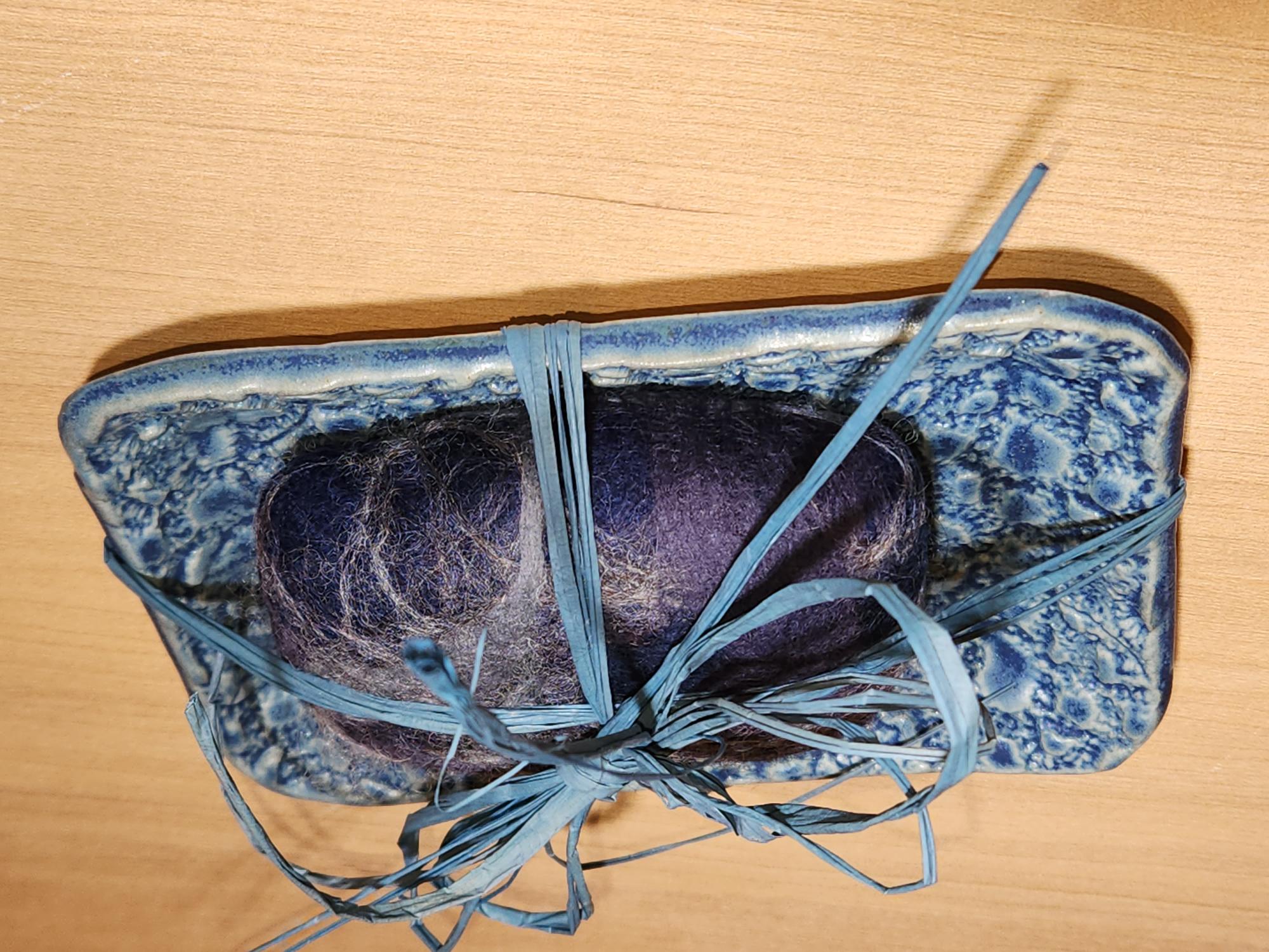 Felted soap means your washcloth and soap are all in one! The felted merino wool acts like an exfoliant and it shrinks smaller and smaller as you use the soap. These lovely gifts are the product of a collaboration between two Blue Moose artists, feltmaker Deb Tewell and potter Susie Morey.