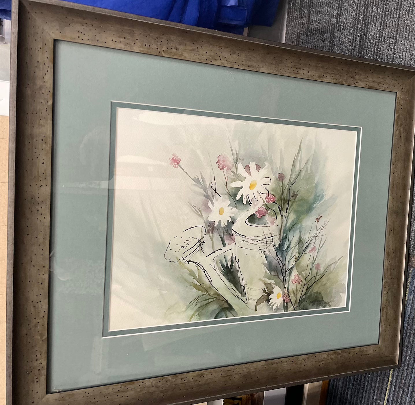Watercolor giclee print of watering can with flowers and greenery with custom framing. Frame Size 19x22. Image size 11x14 by Deb Groesser at Blue Moose Art Gallery