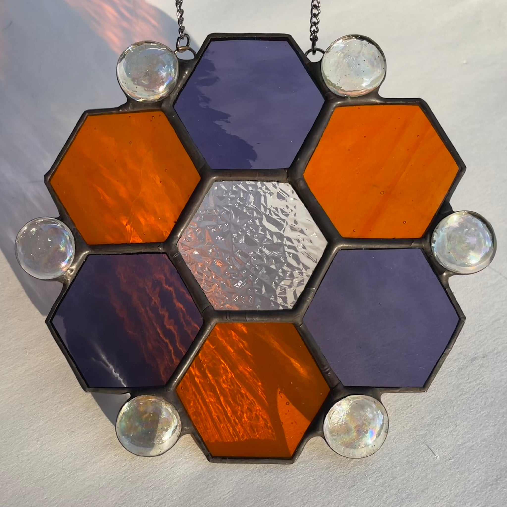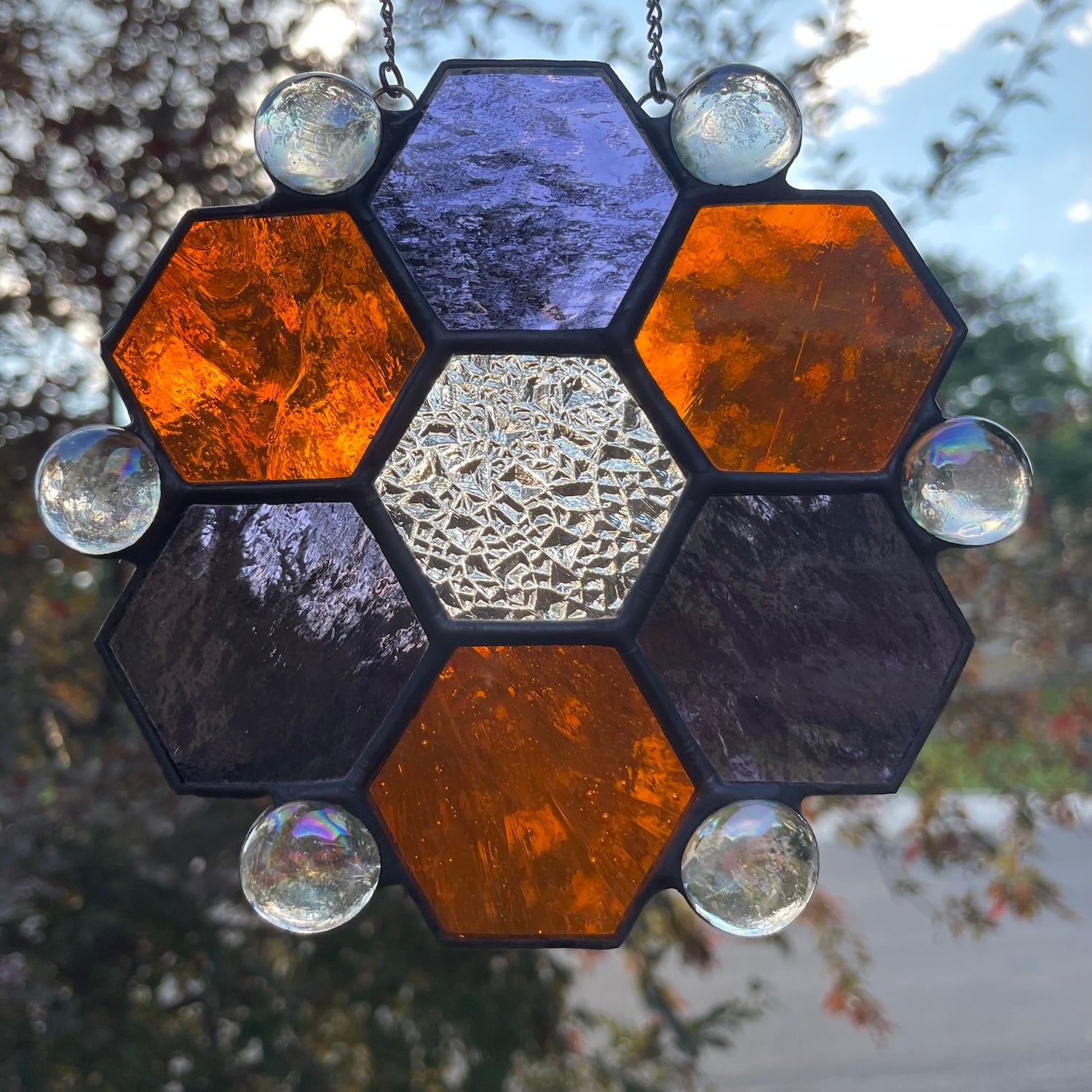 This spooky Halloween themed honeycomb showcases an array of orange, purple, and clear stained glass pieces and features glass gem accents arranged at its corners. by Chandris Zoucha at Blue Moose Art Gallery