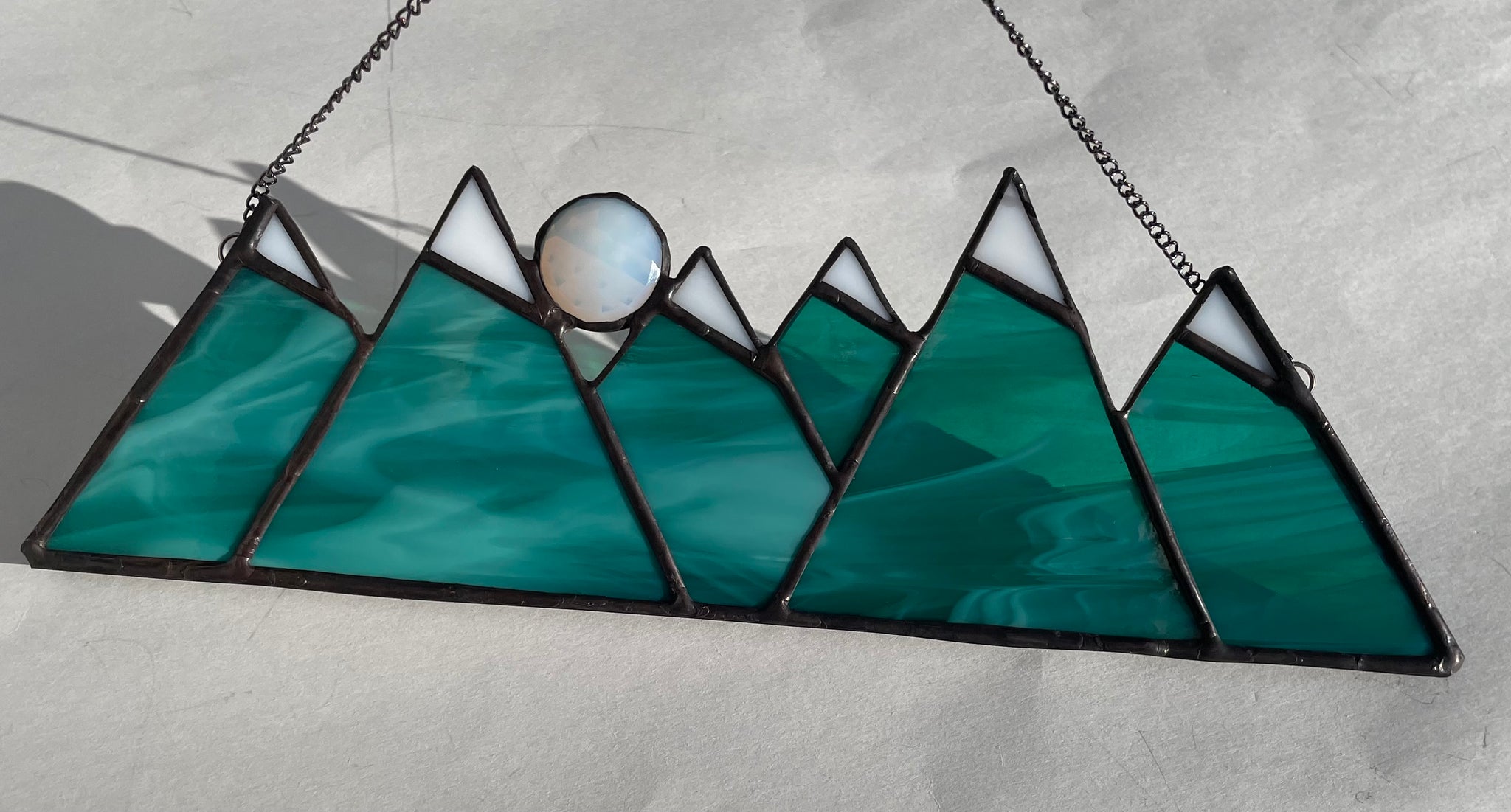 This beautiful green mountain range is made from a dark green wispy glass that has traces of white details and is topped with white snowy peaks. Hanging above the peaks is a gorgeous opal white faceted glass moon.