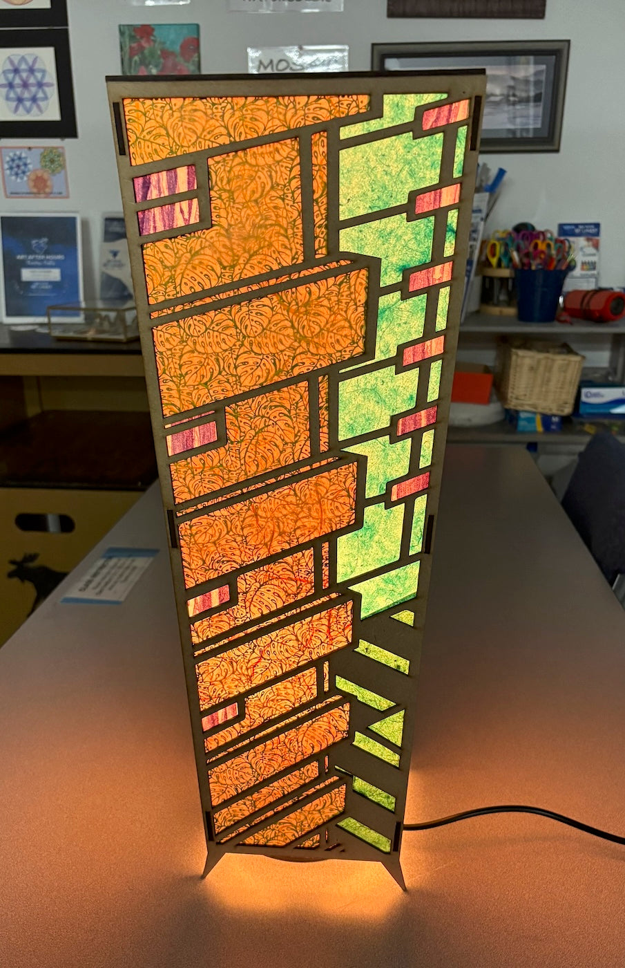 21 inch tall table top luminary with High Rise design by Kendrick Cowdery at Blue Moose Art Gallery