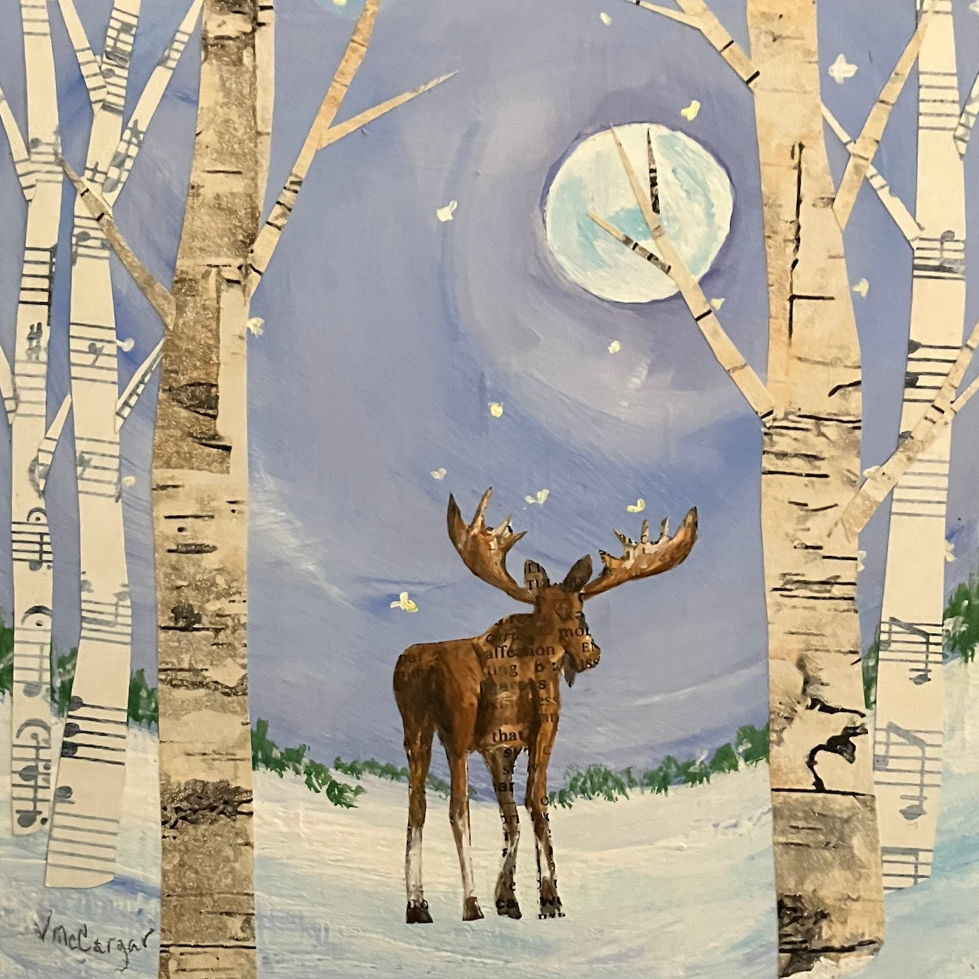 Mixed media collage on 5.5x5.5 inch repurposed wood of a Moose in winter Moonlight. by Vicki McCargar at Blue Moose Art Gallery