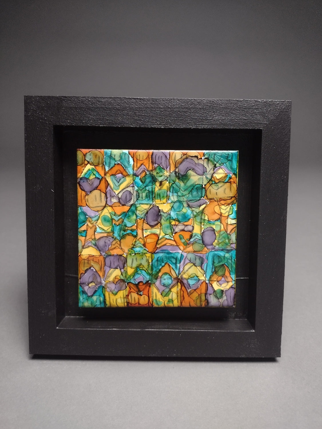 6 inch x 6 inch framed alcohol ink and posca pencil painting on 4 inch x 4 inch ceramic tile.
