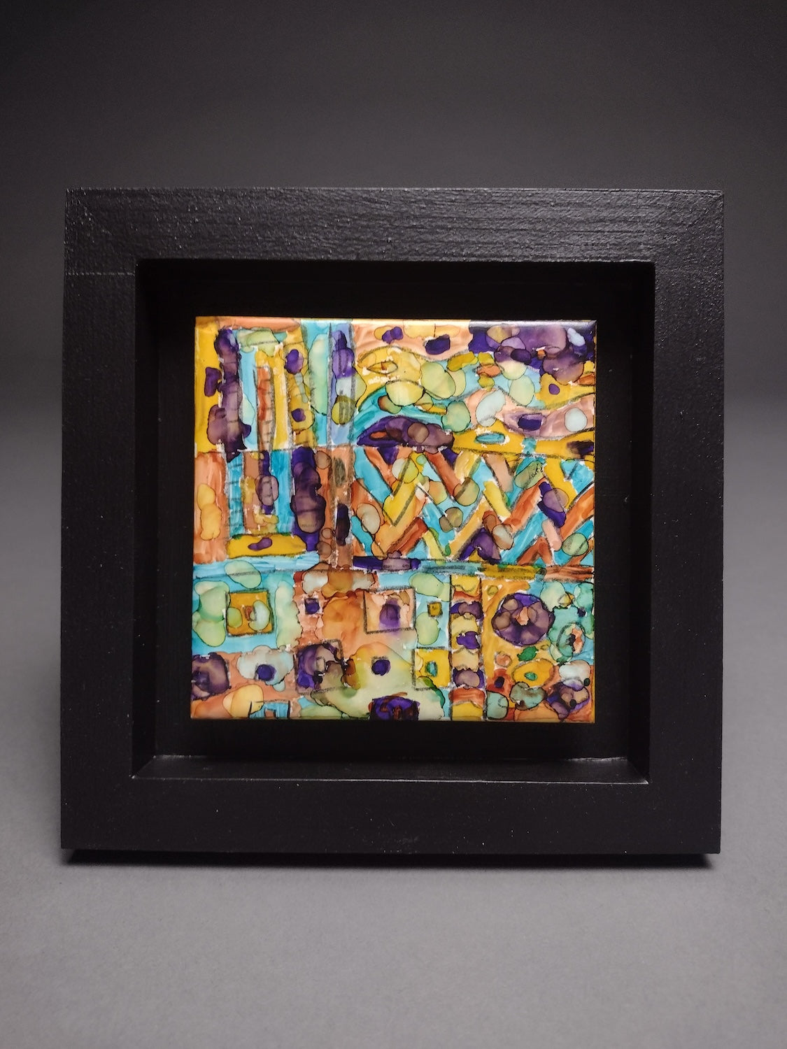 6 inch x 6 inch framed alcohol ink and posca pencil painting on 4 inch x 4 inch ceramic tile.
