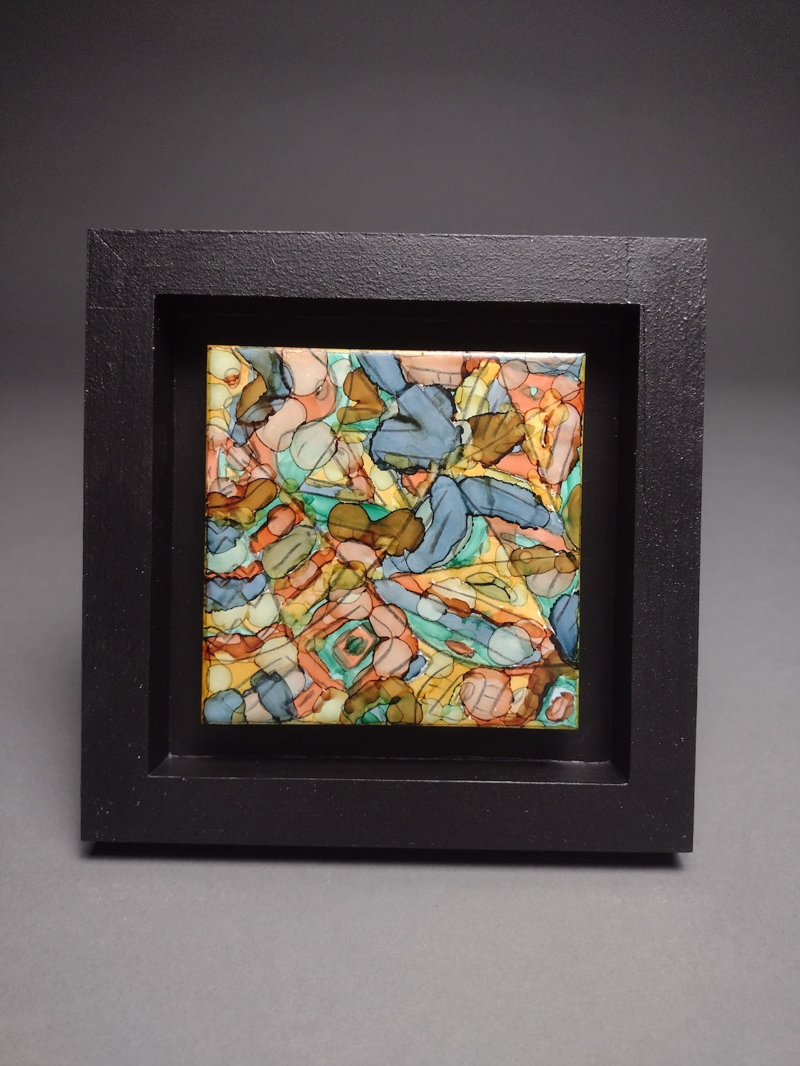 6 inch x 6 inch framed alcohol ink and posca pencil painting on 4 inch x 4 inch ceramic tile.