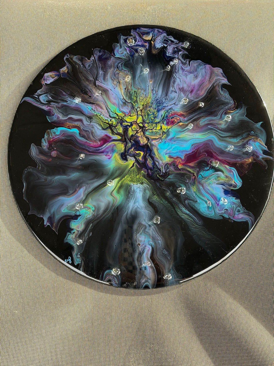 14-inch wooden round. Created with latex paint, acrylics, and mica pigments using the "Bloom Technique". Vibrant multi colors appear. Midnight sky comes alive accented with tiny fragments of gold reflective glass. Top finished with UV protected artis resin. May be easel placed or wall hung.