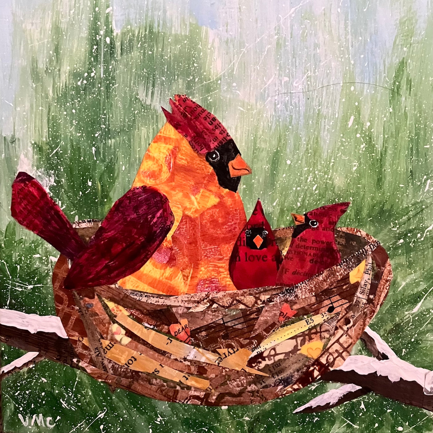 Mixed media collage on 5.5x5.5 inch repurposed wood of mother Cardinal and two baby birds in nest.