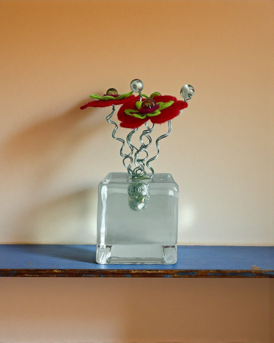 Square Vase with 3 Red and Green Flowers by Melanie Fischer at Blue Moose Art Gallery