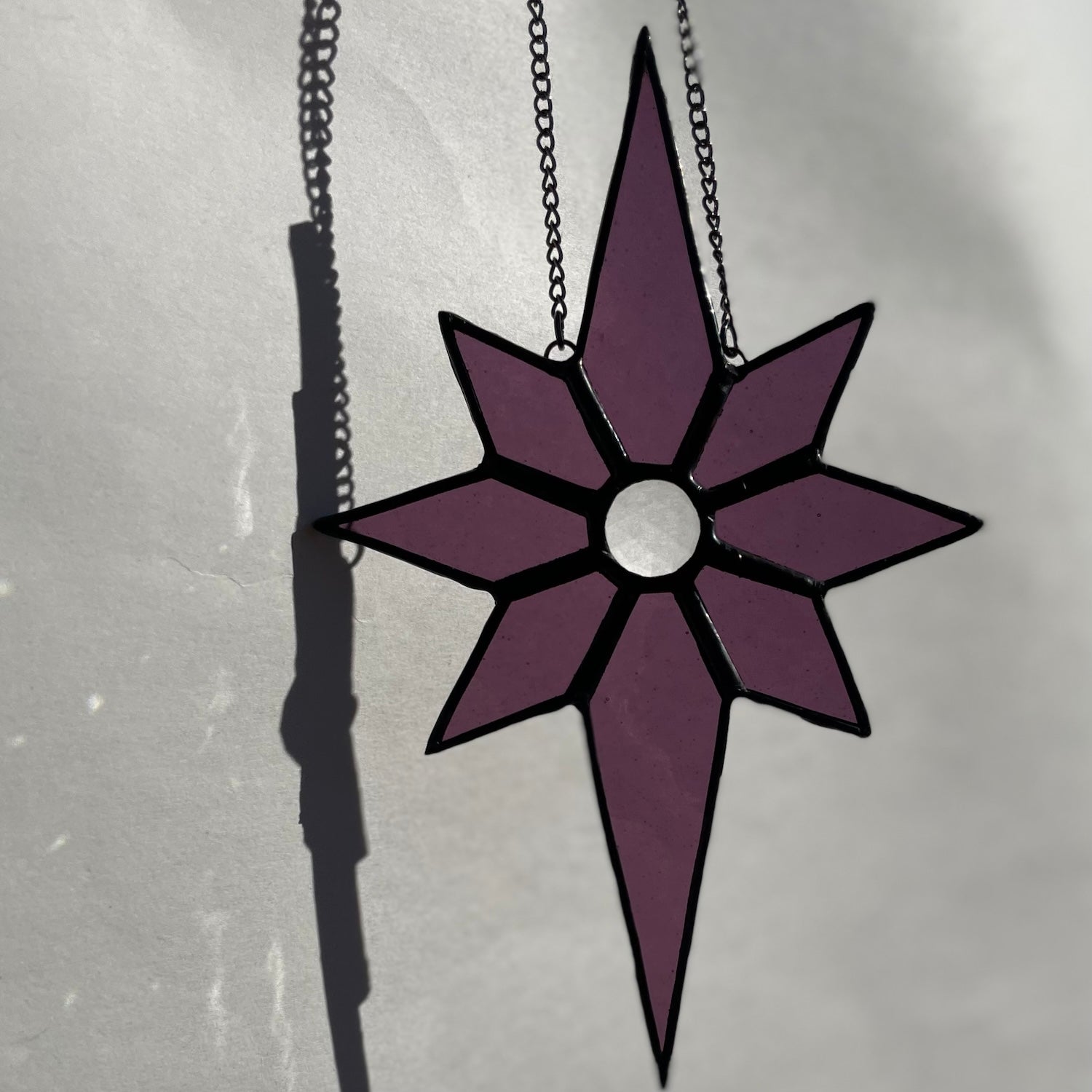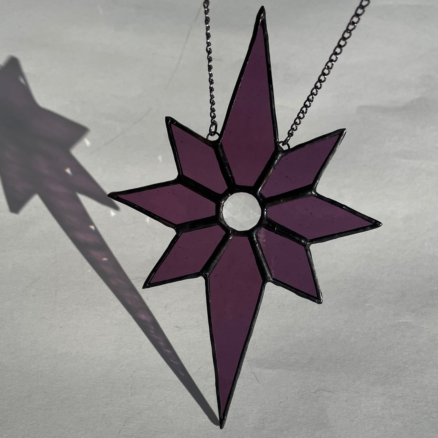This gorgeous holiday star is made from a beautiful transparent, purple glass and features a faceted clear glass center. Perfect for any window or tree!