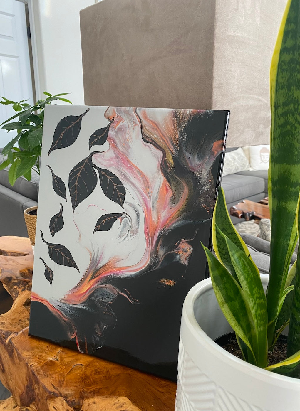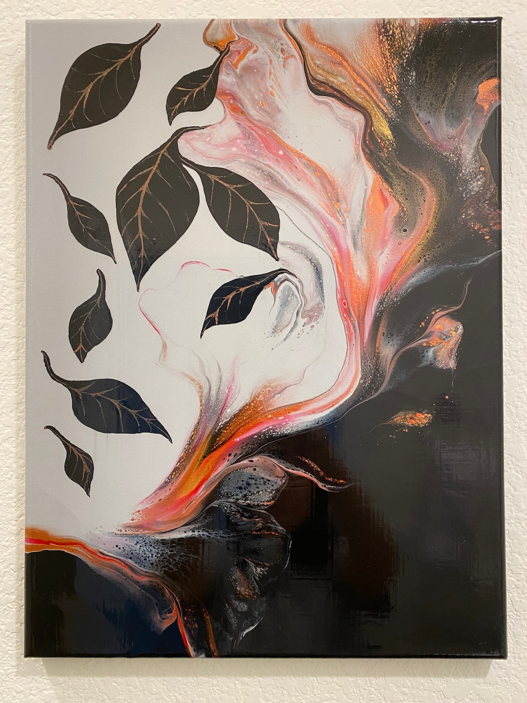 16 inches x 12 inches original acrylic pour painting with added embellishment. by Suki Campbell at Blue Moose Art Gallery
