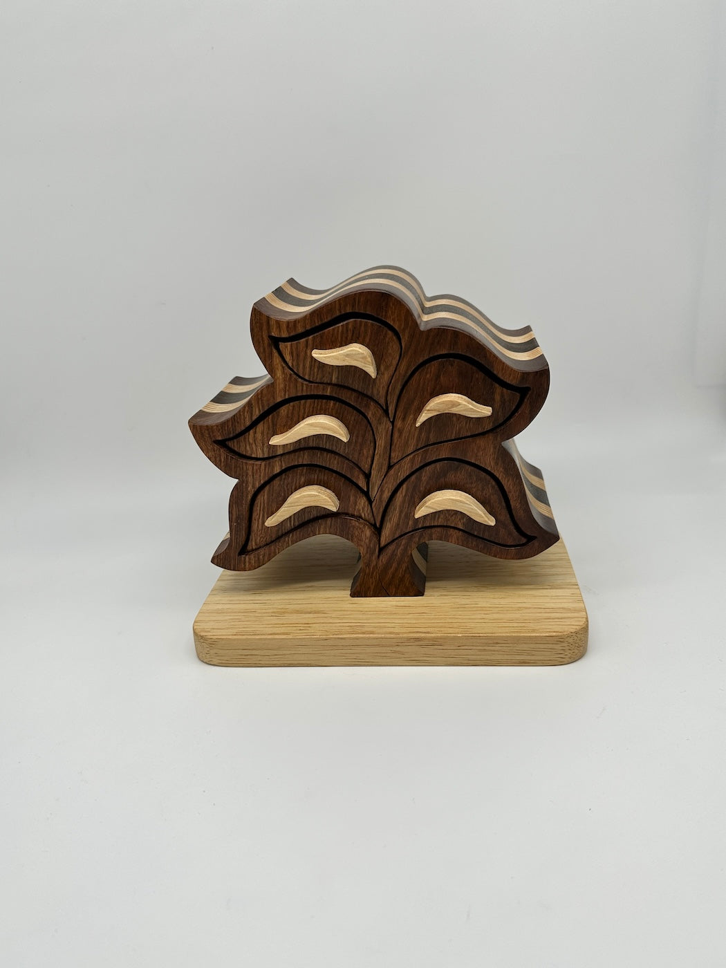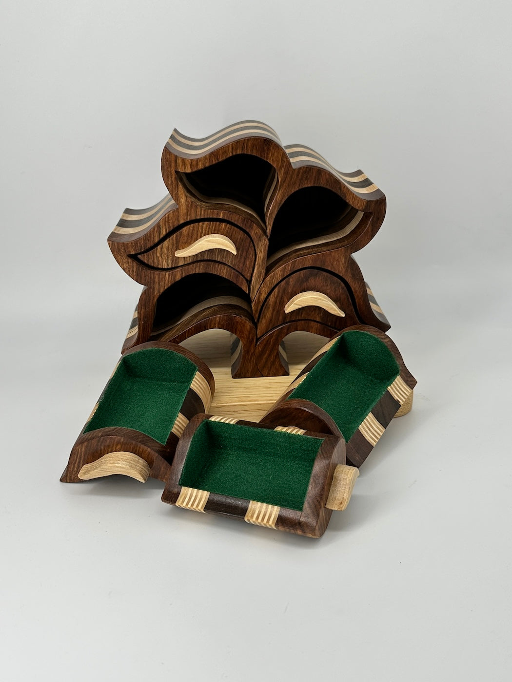 This beautiful and complex box with its graceful sweeping lines brings to mind a beautiful tree whose water laden leaves are about to shed water so they can spring back upright. It measures 8 inches across at the base, is 7.5" high and 5 inches deep at the base. It is made from beautifully figured dark brown Chechen wood, with a Walnut center stripe surrounded by Baltic Birch plys, has handles of Primavera wood and sits on a base of Primavera wood.