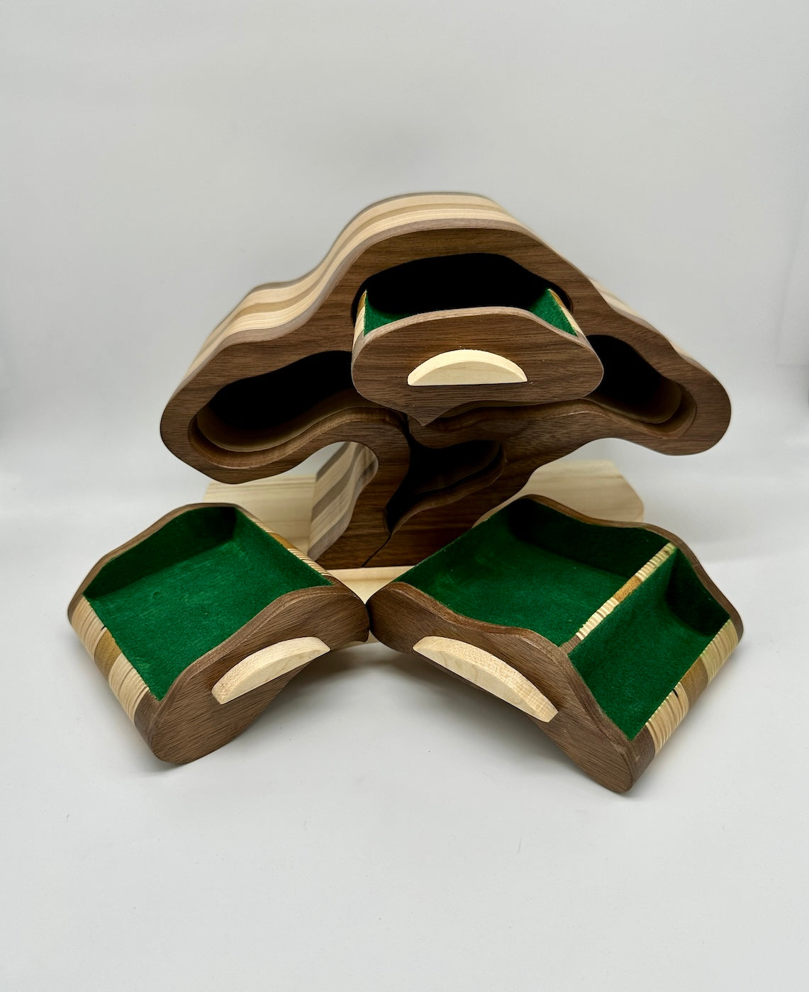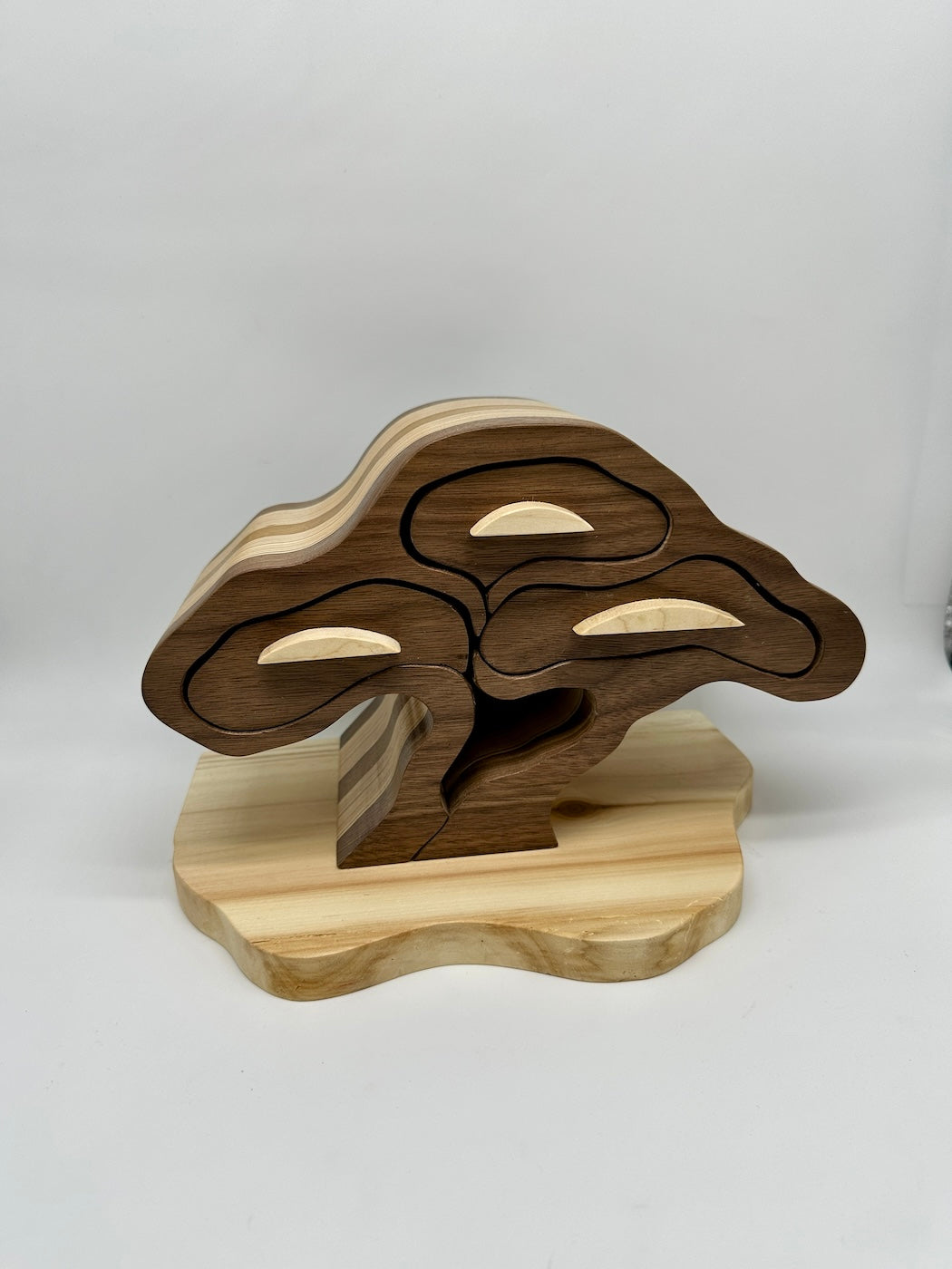 This beautiful piece, reminiscent of an acacia tree, is made from Walnut with a Canary Wood center surrounded by Baltic Birch plys, with maple handles and a locally sourced Aspen wood base. It measures 8.5 inches high by 11 inches wide at the base, and is 7.5 inches deep at the base. Each part shows off the natural beauty of the wood - there are no wood stains or dyes. The natural wood is simply protected by a clear coat of shellac and lacquer.