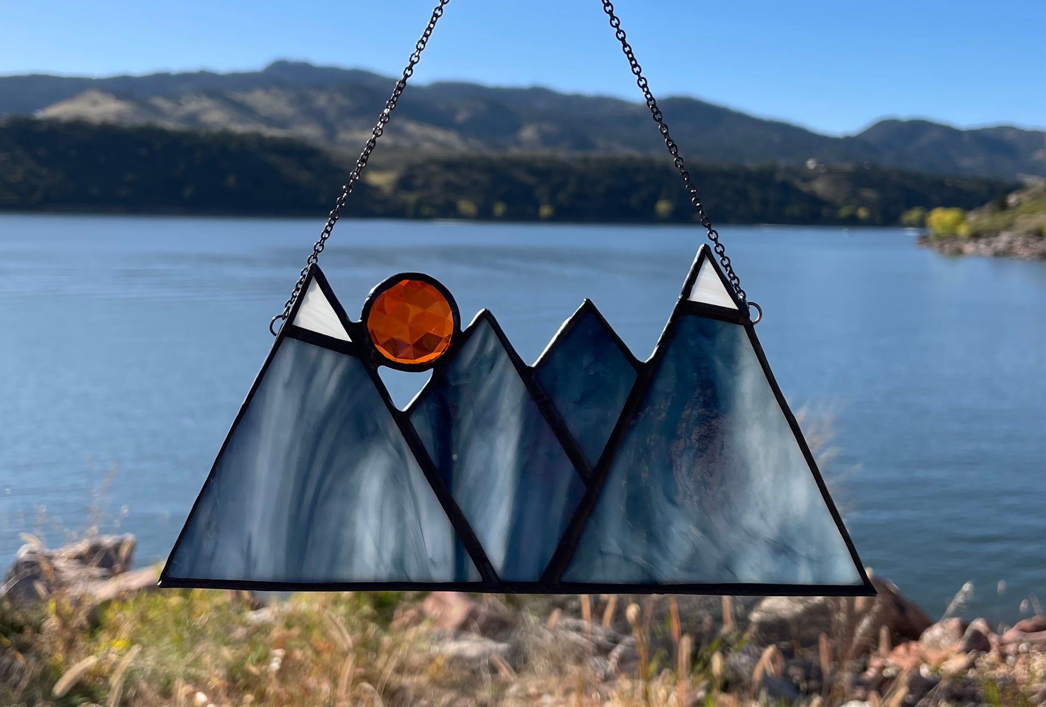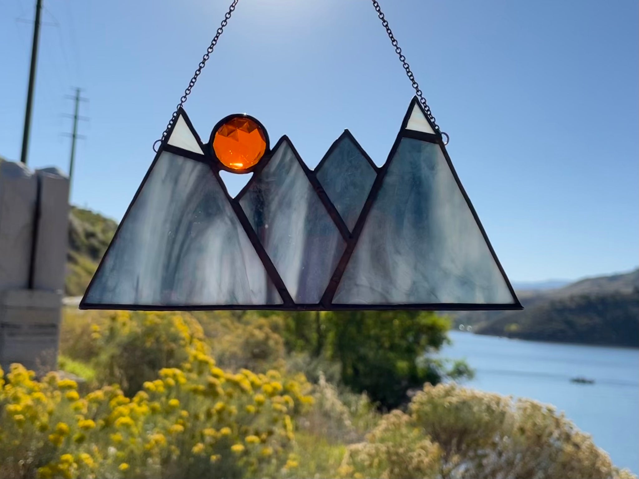 Halloween themed, dark and moody, this stained glass mountain range also features a sparkling orange gem sun.
