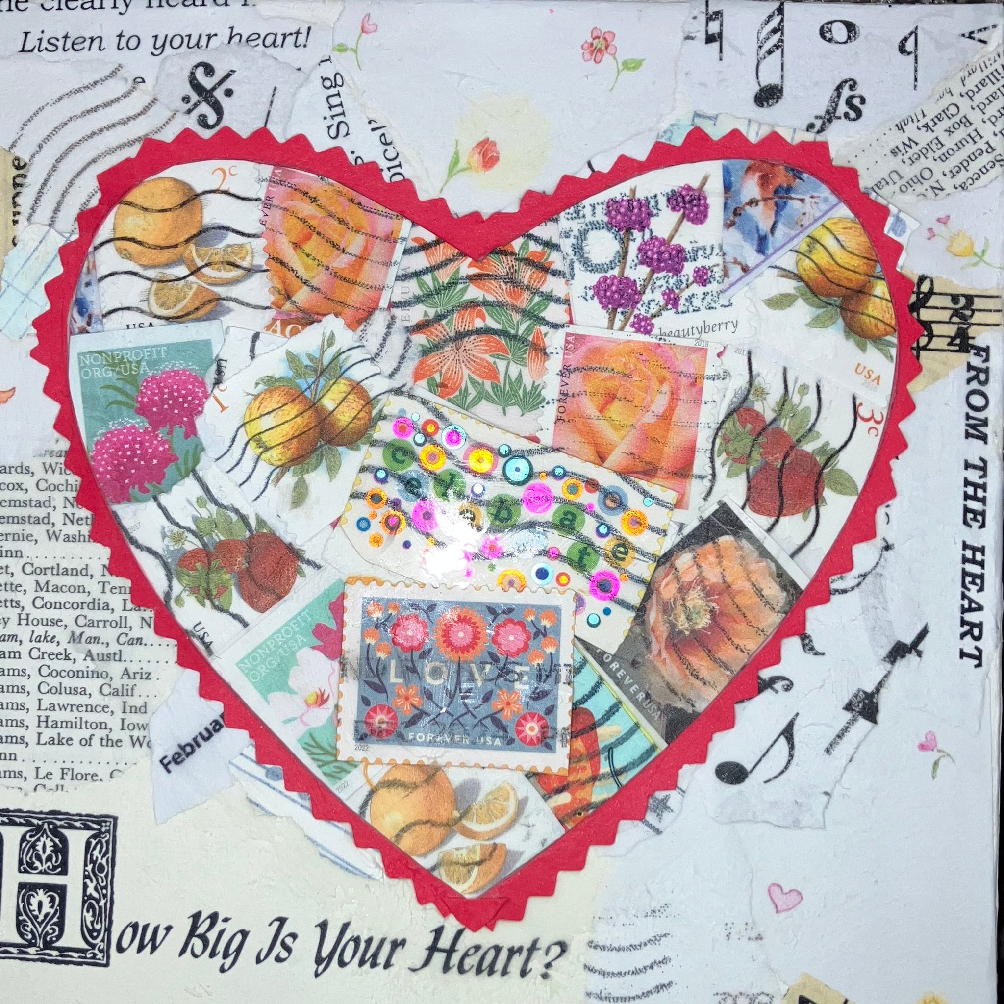 Get ready to send some love this Valentine’s Day with a mixed media collage using cancelled postage stamps and a variety of repurposed paper. All supplies and instruction provided to create a 5x5 inch collage on a ready to hang wood block.