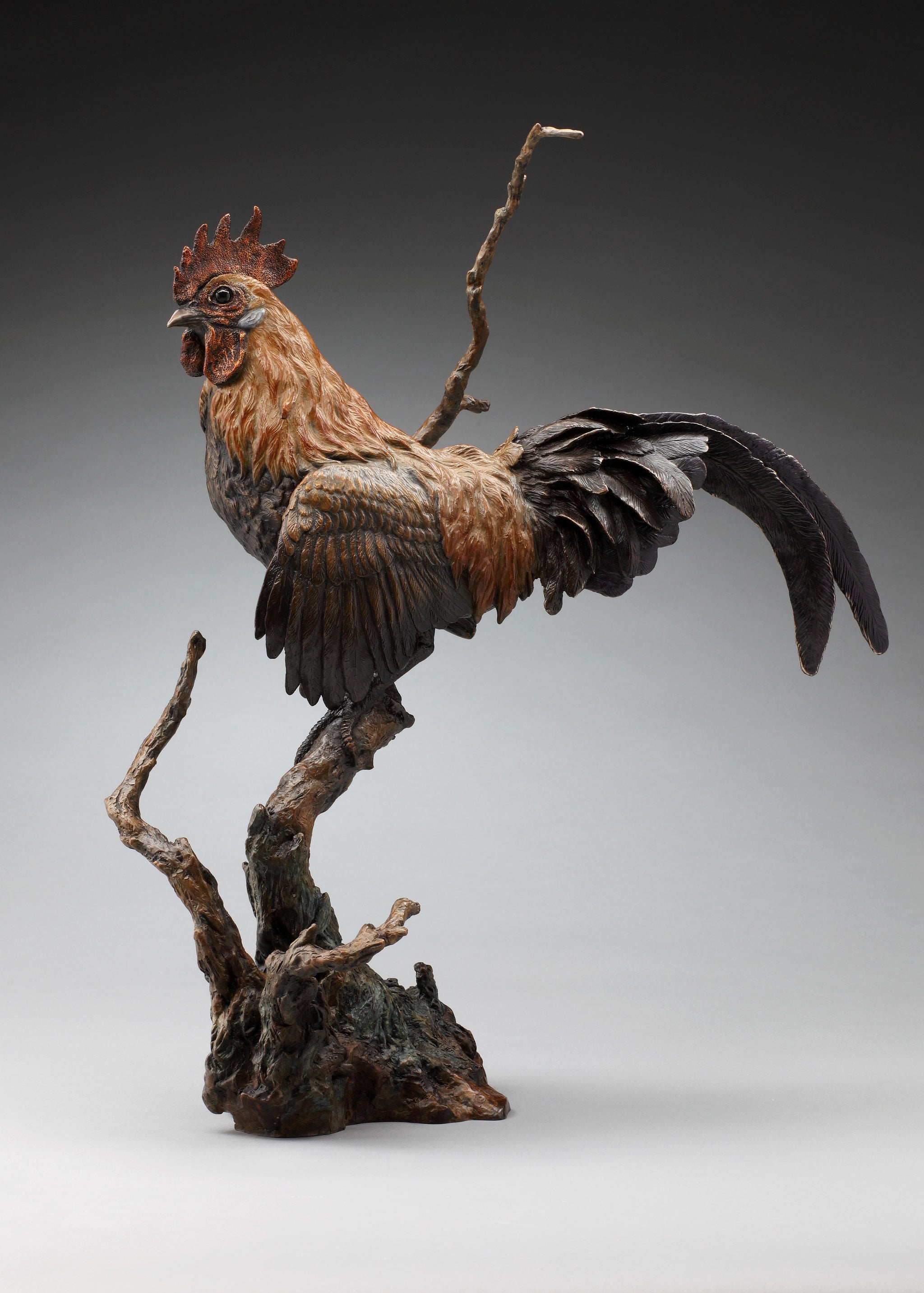 “Wild Thing” depicts a hybrid rooster after breeding together a Brown Leghorn Bantam with a Jungle fowl… the wild progenitor of the domestic chicken we know today. Jungle fowl are still found will in the jungles of Asia and are frequently gorgeous additions to the exotic fowl collections of fanciers. This sculpture was originally commissioned by a breeder of exotic bantams in Saskatchewan, CANADA. He was very specific about what he wanted in the bird, providing me with multiple photos of this hybrid… but left the overall composition up to me. He wanted it elegant and at least 20” tall as it was destined to be placed on the grand piano in his solarium. He sent me photos after it arrived at his place and had been placed on the gorgeous grand piano amid huge ferns and crystal chandeliers. He was VERY pleased!!