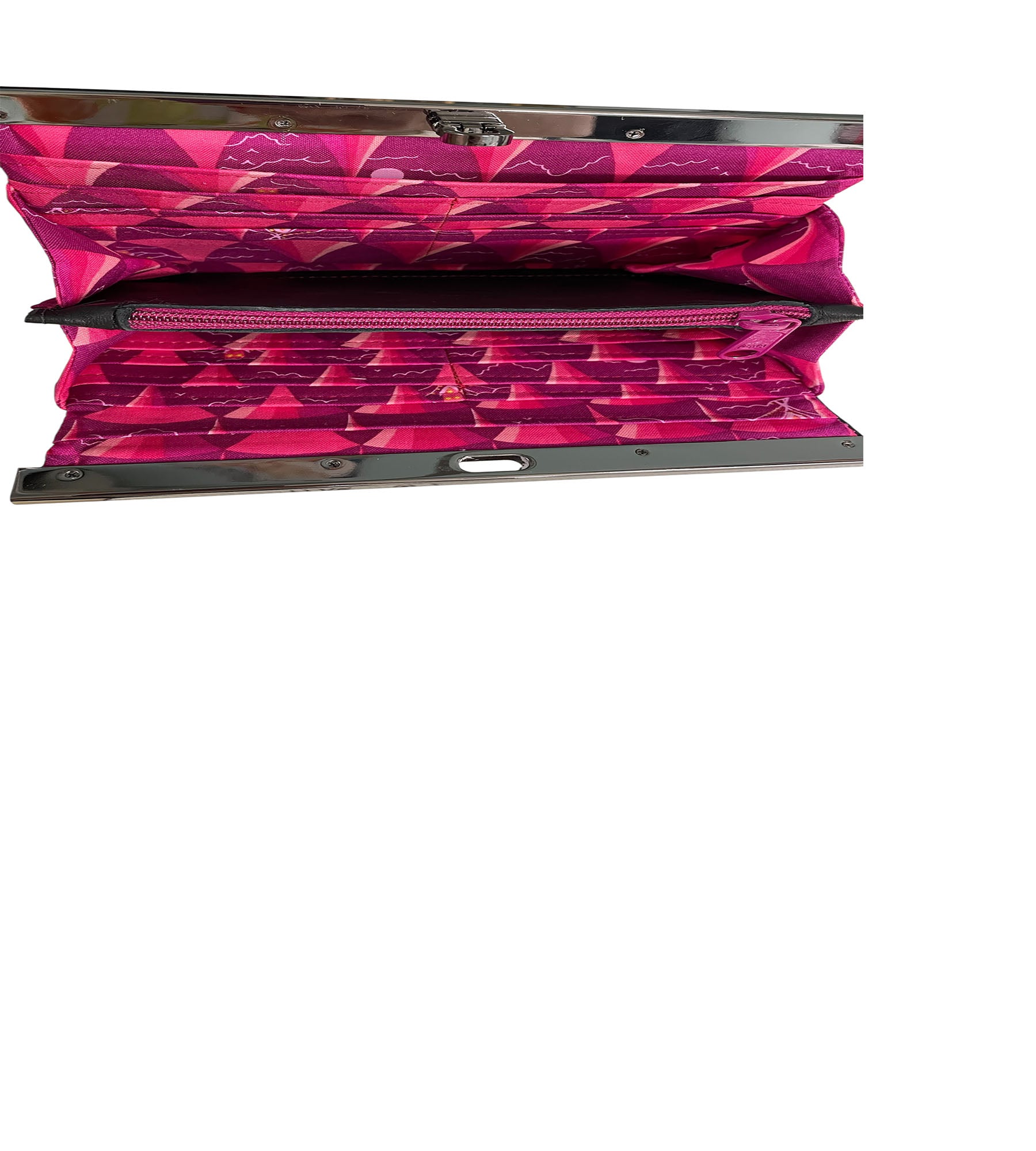 Like the Elegant Sophistication Wallet, this sophisticated, versatile wallet features fine-quality leather with subtle texture, and a silver clasp mechanism closure. The fuchsia interior fabric features 6 credit card compartments, 2 larger compartments for bills and documents and an integrated center change purse. Dimensions: 4 3/4 inches tall, 7 1/2 inches wide and 1 inch deep.