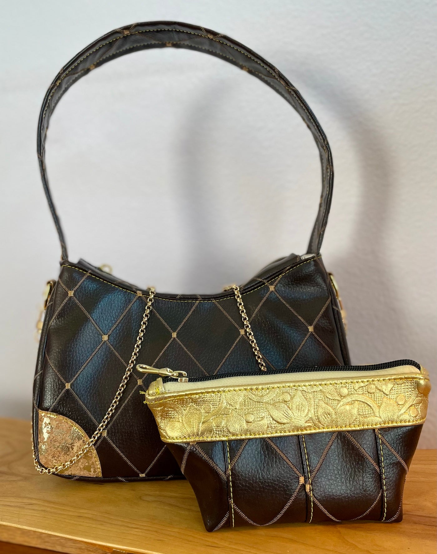 Elegant and bold, this shoulder/crossbody shines. A touch of gold leather, and gold cork embellishments mixed with a rich brown, lined vinyl will take you anywhere, with grace! A generous slip pocket on the inside allows for a separation of necessities, and to add to this bags functionality, a lovely, matching cosmetic case comes with. A zipper closing added to the recessed top makes this a comfortable shoulder bag. An added detachable gold crossbody chain gives you the choice of making it shoulder or crossbody. Bag size: 6 inches tall, 10 inches wide, 3.5 inches deep.