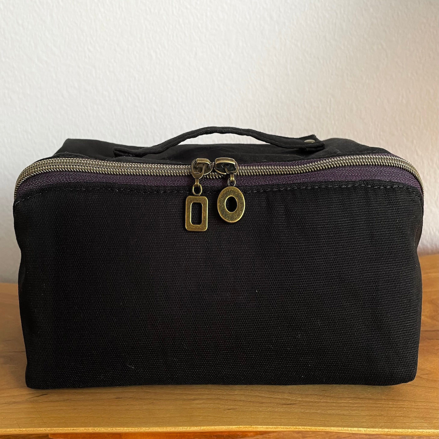 This unique oblong-shaped travel pouch will surprise you how accessible it becomes. Made of cotton broadcloth and vinyl, you can fill all the multiple inside sections, and vinyl zip pocket, and be ready to ROLL. Size: 4 1/4 inches tall, 10 1/2 inches wide, and 4 1/4 inches deep.