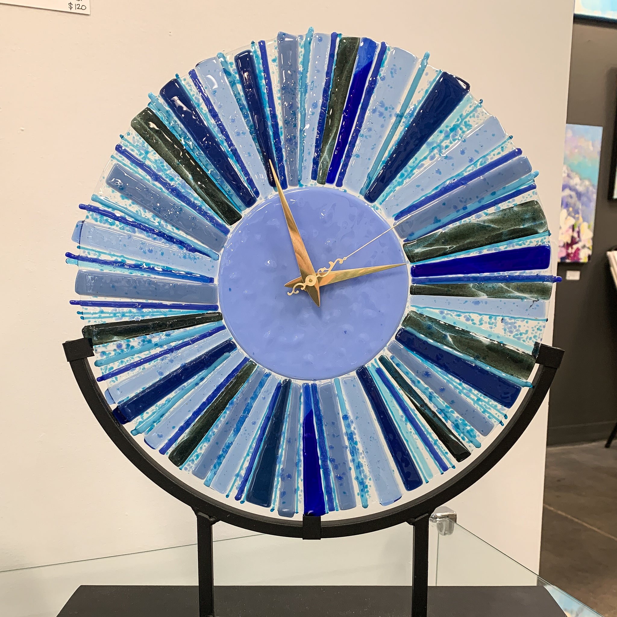Fused glass clock in stand or without the stand, would make a striking wall clock.