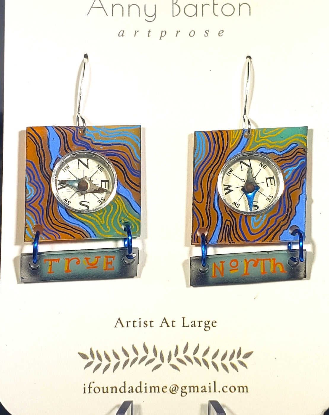 Square terrain map with tiny Japanese compasses and the words True North Silver plated ear wires by Ann Barton at Blue Moose Art Gallery