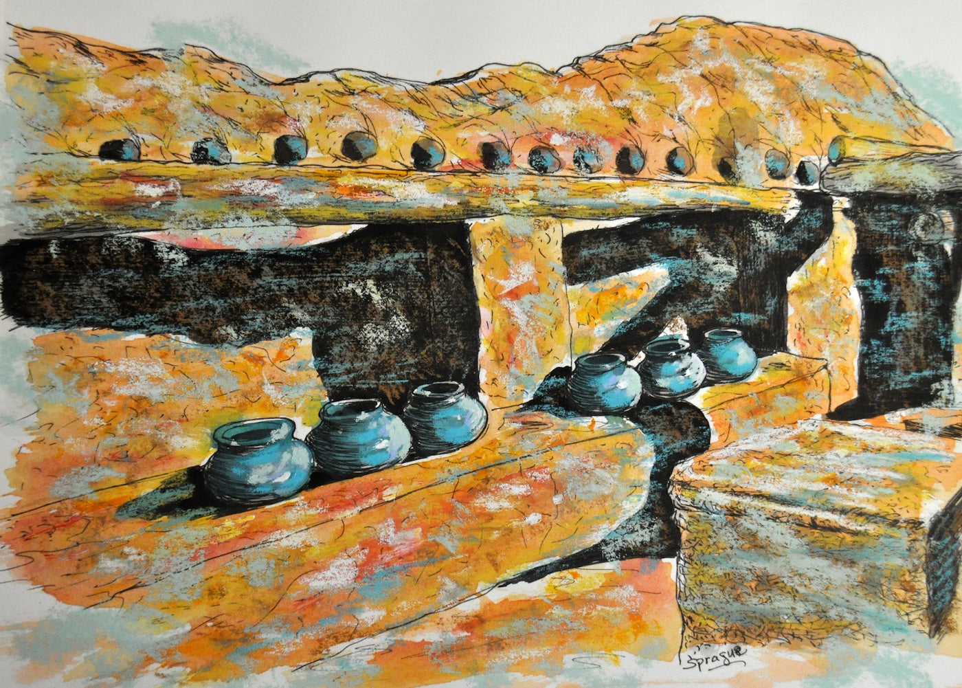 The beautiful Mission San Jose de Tumacacori is a historic Spanish mission near Nogales, Arizona, a partially preserved ruin. Here O’odham, Yaqui, and Apache people met and mingled with European Jesuit and Franciscan missionaries. This is my mixed media painting of pottery I found there. This original painting measures 11x14 and has been custom matted and framed to 18x21 overall.