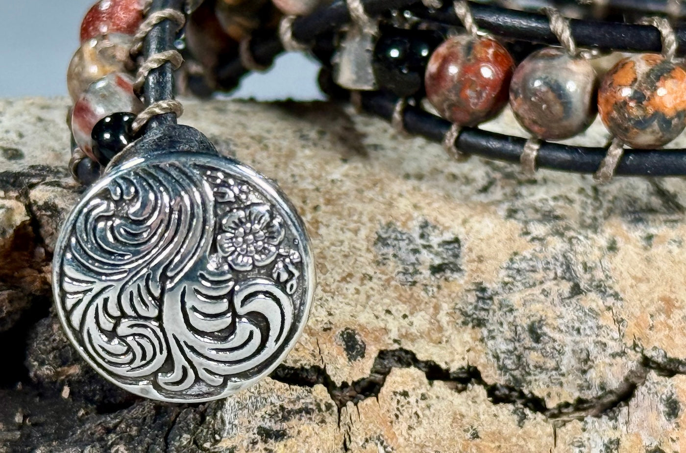 Handmade beaded gemstone and leather double-wrap bracelet Stone: multicolor and black gemstone Silver-tone decorative beads Black leather Size: 14 inches by Julianne Alley at Blue Moose Art Gallery