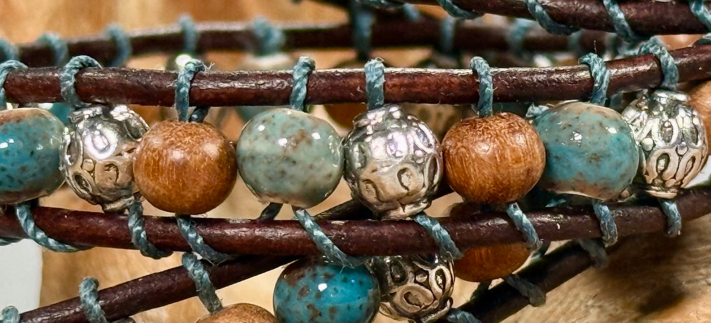 Handmade beaded ceramic and leather double-wrap bracelet Stone: blue ceramic and brown wood Silver-tone decorative beads Brown leather Size: 14 inches by Julianne Alley at Blue Moose Art Gallery