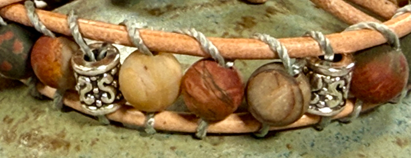 Handmade beaded ceramic and leather double-wrap bracelet Stone: multicolor jasper gemstone Silver-tongued decorative beads Brown leather Size: 14 inches by Julianne Alley at Blue Moose Art Gallery