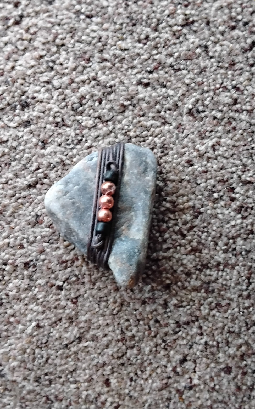 Gray triangular shaped rock with black leather wrap and 3 round copper beads. Approximately 1.5 inches by 1.5 inches. by Kathryn Bethna at Blue Moose Art Gallery