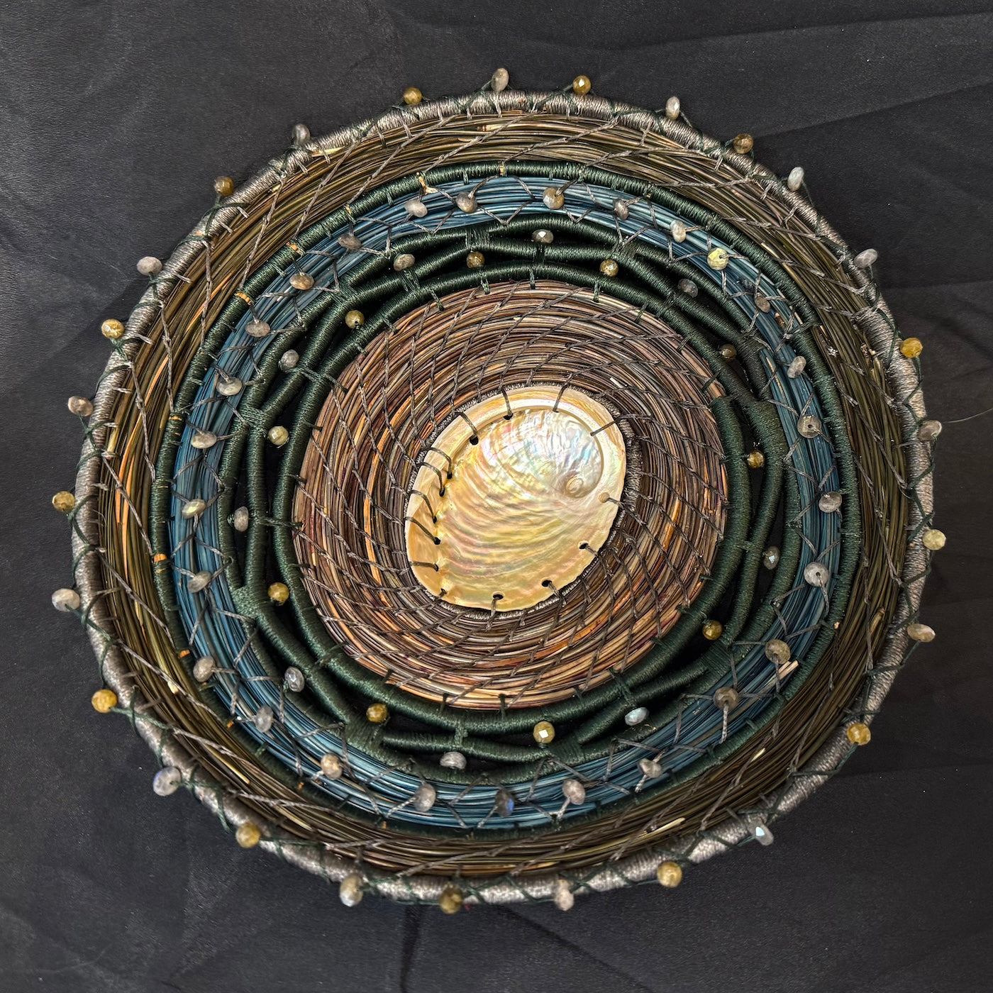 12 inches round by 4 inches tall. Abelone chill and accented with labradorite beads. by Lisa Winta at Blue Moose Art Gallery