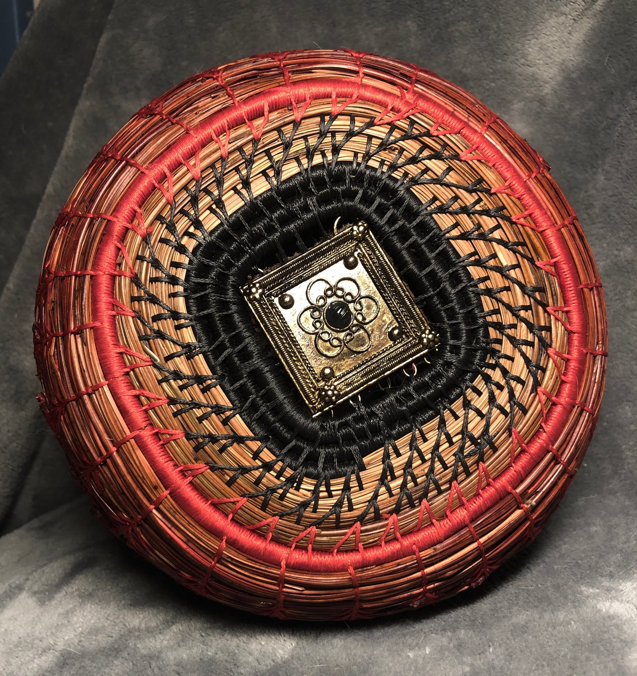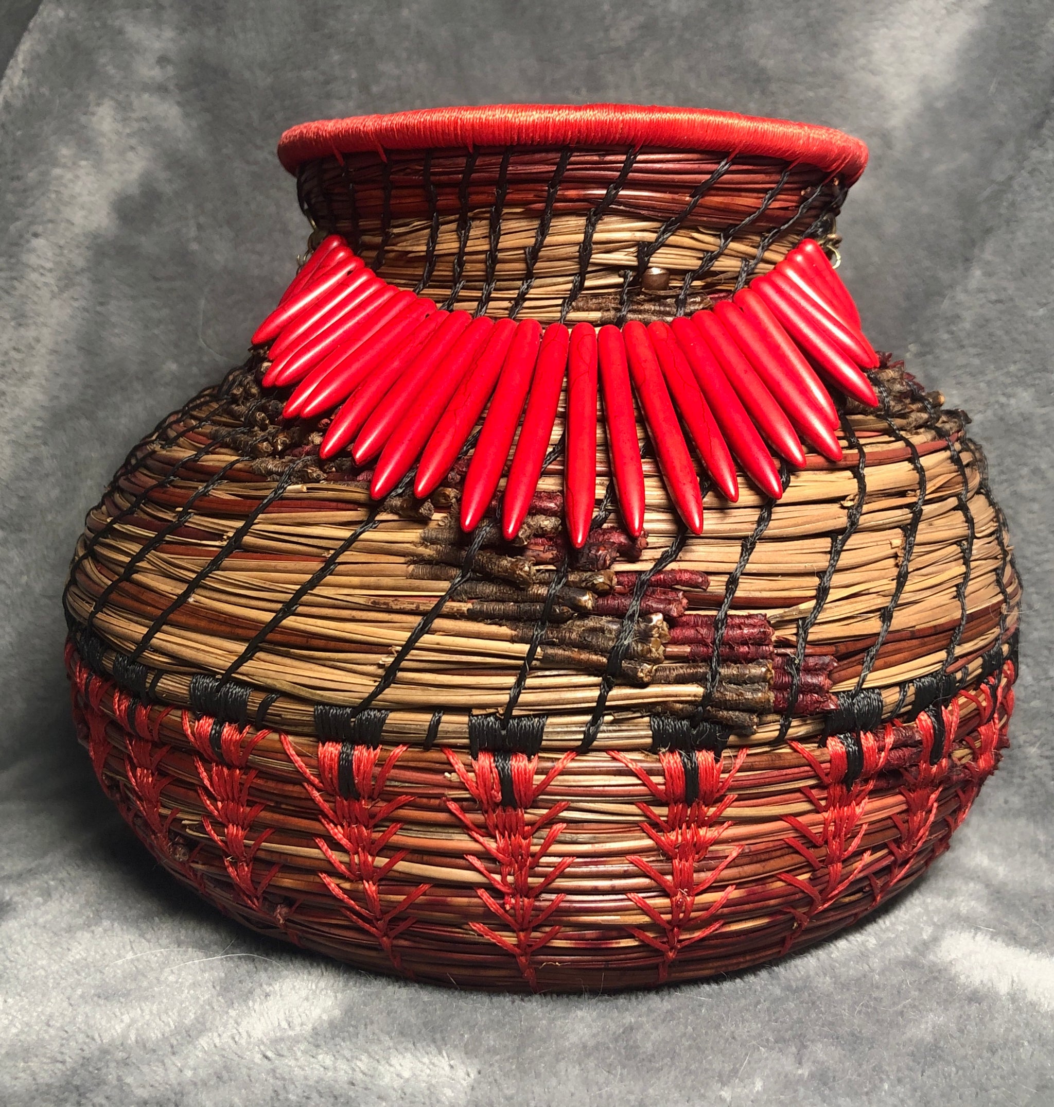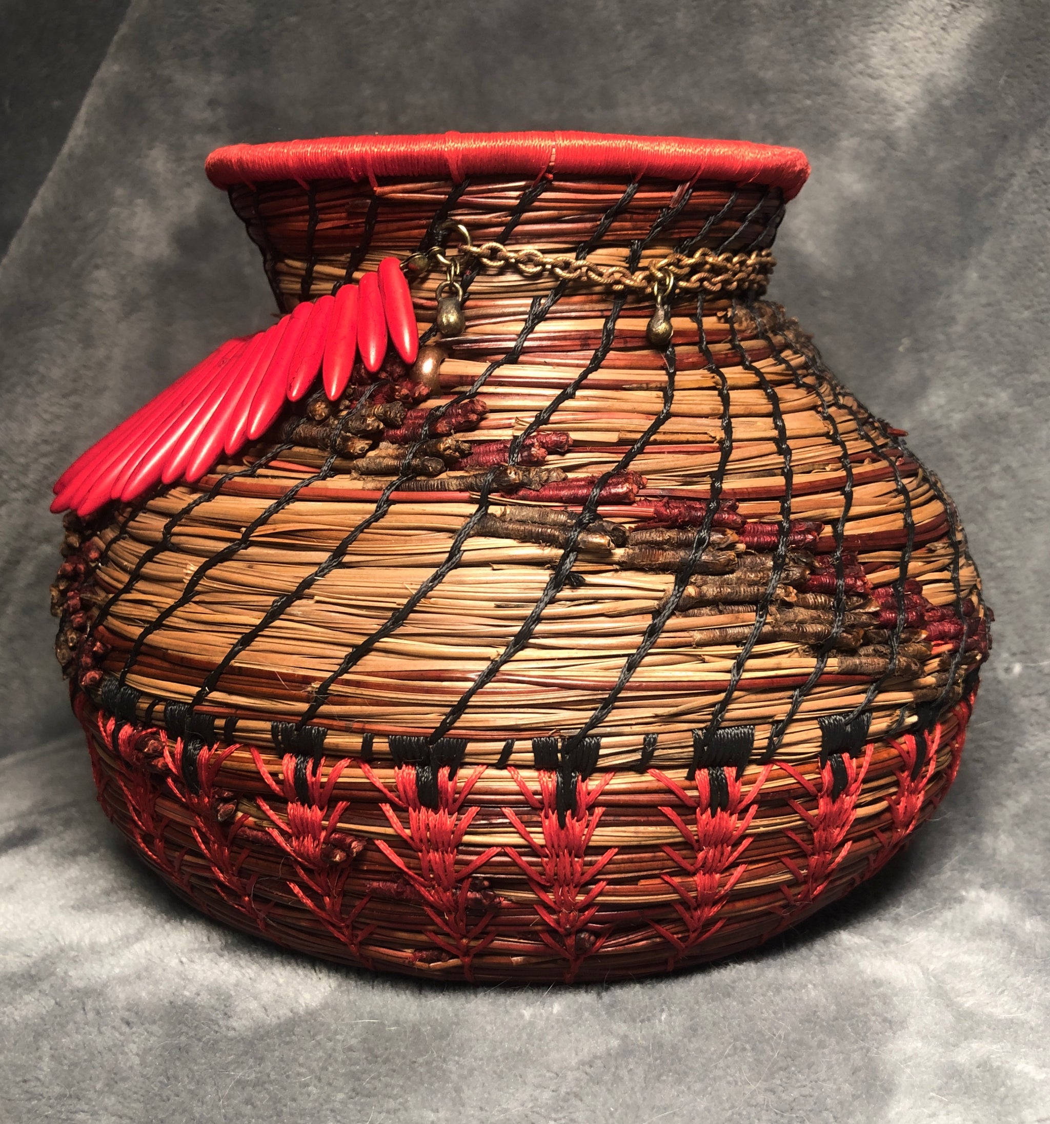 Pine Needle Basket accented with red howlite and brass beads. The basket is 10 inches round by 9 inches tall.