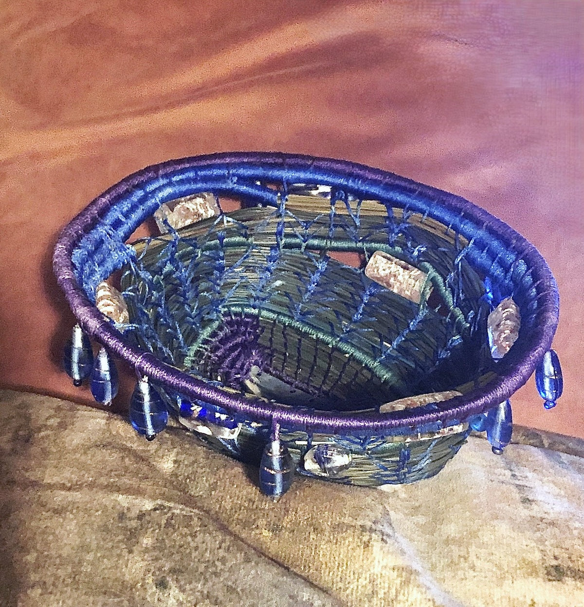 Pine Needle Basket woven with green-dyed pine needles woven with blue, teal and purple threading accented with glass beads and shell. The basket is 9 inches by 8 inches by 5 inches.