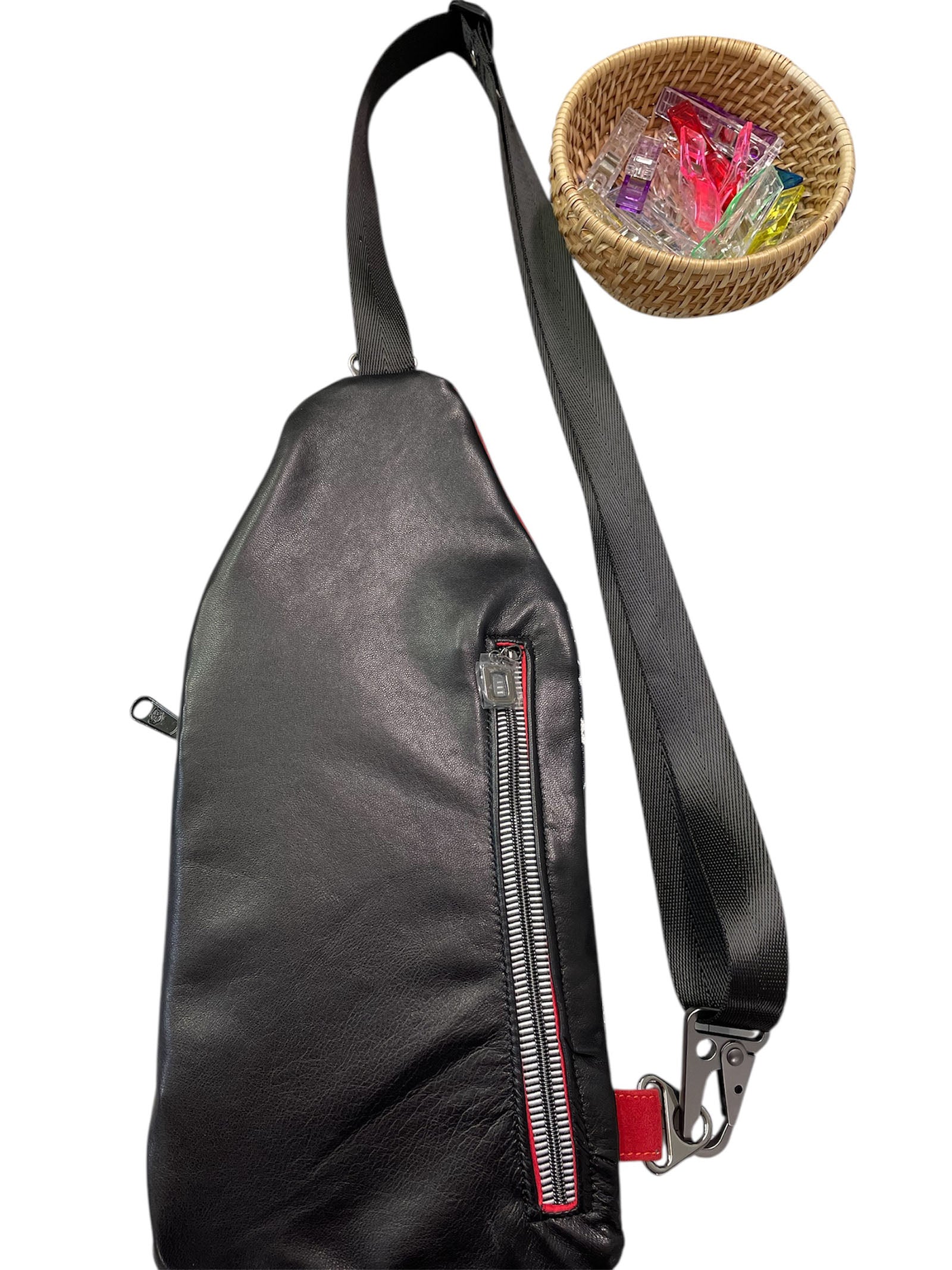 This Pretty in Red and Black Sling is a sleek, modern crossbody bag with a distinctive teardrop silhouette that combines bold color blocking with artistic pattern work. This stylish sling features vibrant red suede accents paired with an abstract black and white sturdy cotton pattern work, and full black leather backside. Multiple compartments keep essentials organized and accessible. Its teardrop silhouette contours comfortable against the body, and the black adjustable webbed strap allows for customized length. Features: ergonomic design, horizontal zippered front pocket; vertical zippered back pocket and long, spacious slip pocket extending from top deep into the bags interior. Dimensions: 5 1/2 inches W x 12 1/2 inches T x 1/2 inch D.