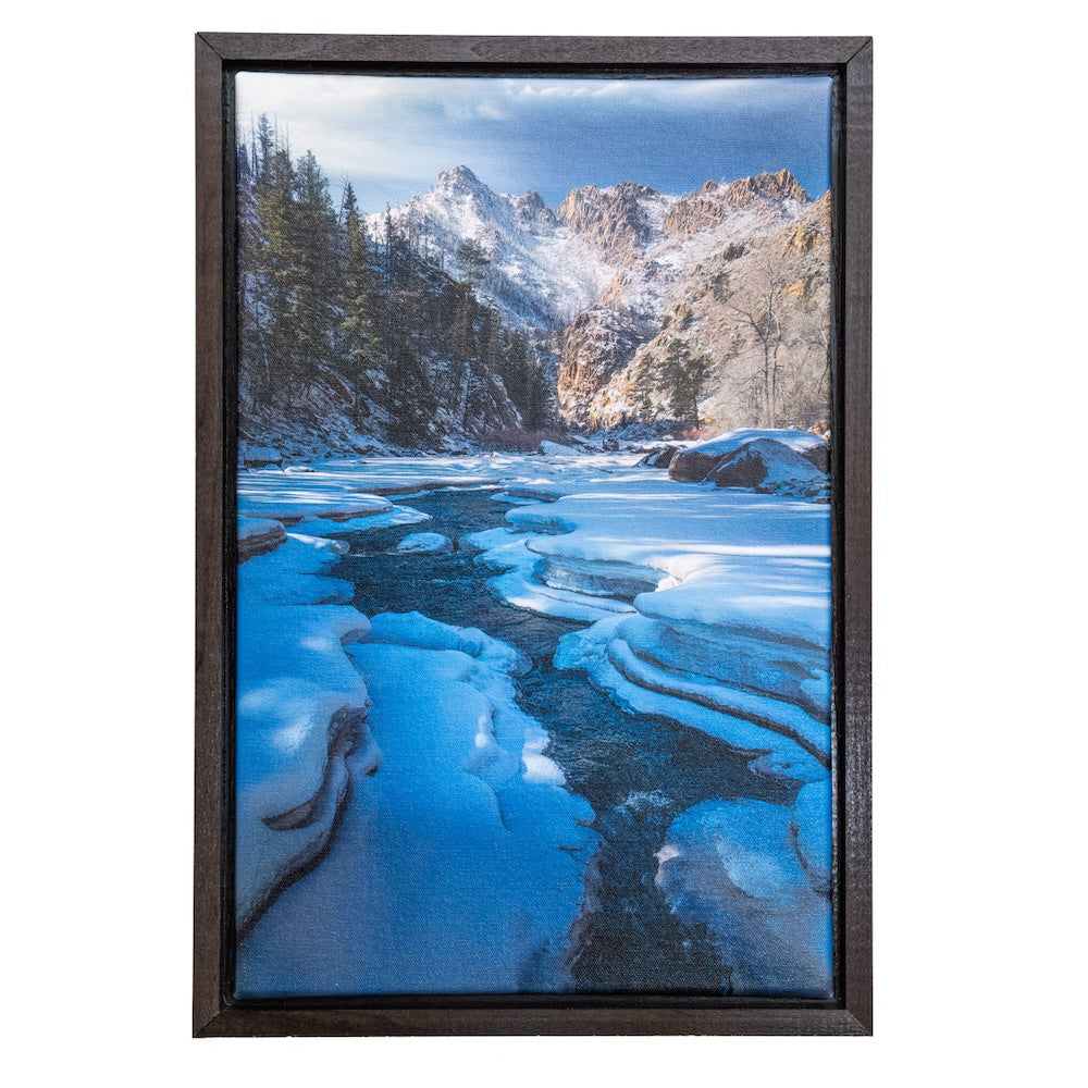 A Ribbon of the Poudre River winds through its Winter-Bound Canyon, its dark, flowing waters carving a path between Sculpted Ice and Snow-Laden banks. The Morning Sun glances off the frosted peak beyond, casting a Cold Brilliance against the endless Colorado Blue Sky; a striking contrast to the Crystalline Whites and Icy Blues. There is Power in this Frozen Stillness - an Untamed Force beneath the Delicate Frost. It is Winter’s Beauty at its Purest, a scene so perfect it feels lifted from a Snow-Dusted Fairy Tale.