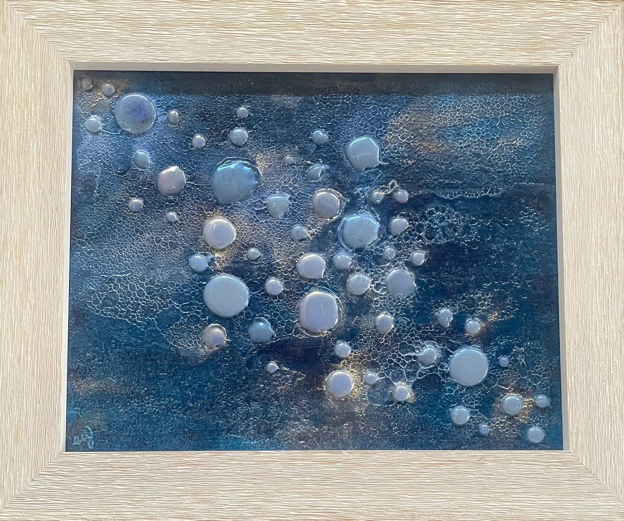 10x8-inch canvas set in a rustic off-white wooden frame. Total size is 12-1/2x10-1/2 inches. Bubbles, bubbles, and more bubbles are the theme here. Composed of textured UV cured resin and household materials. Hues of, teal, green, and gold mica pigments add shimmer and depth to the piece.